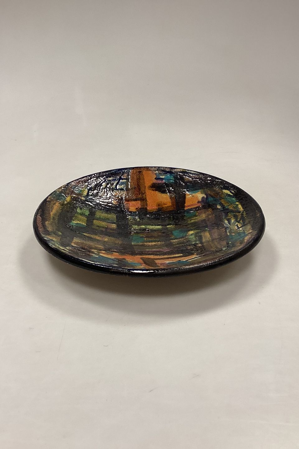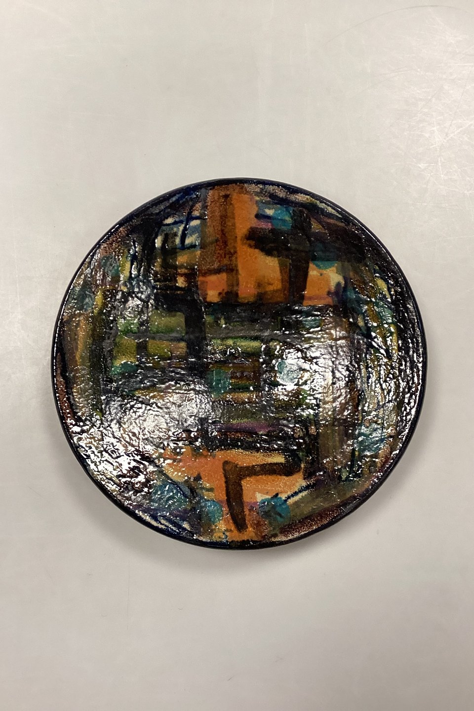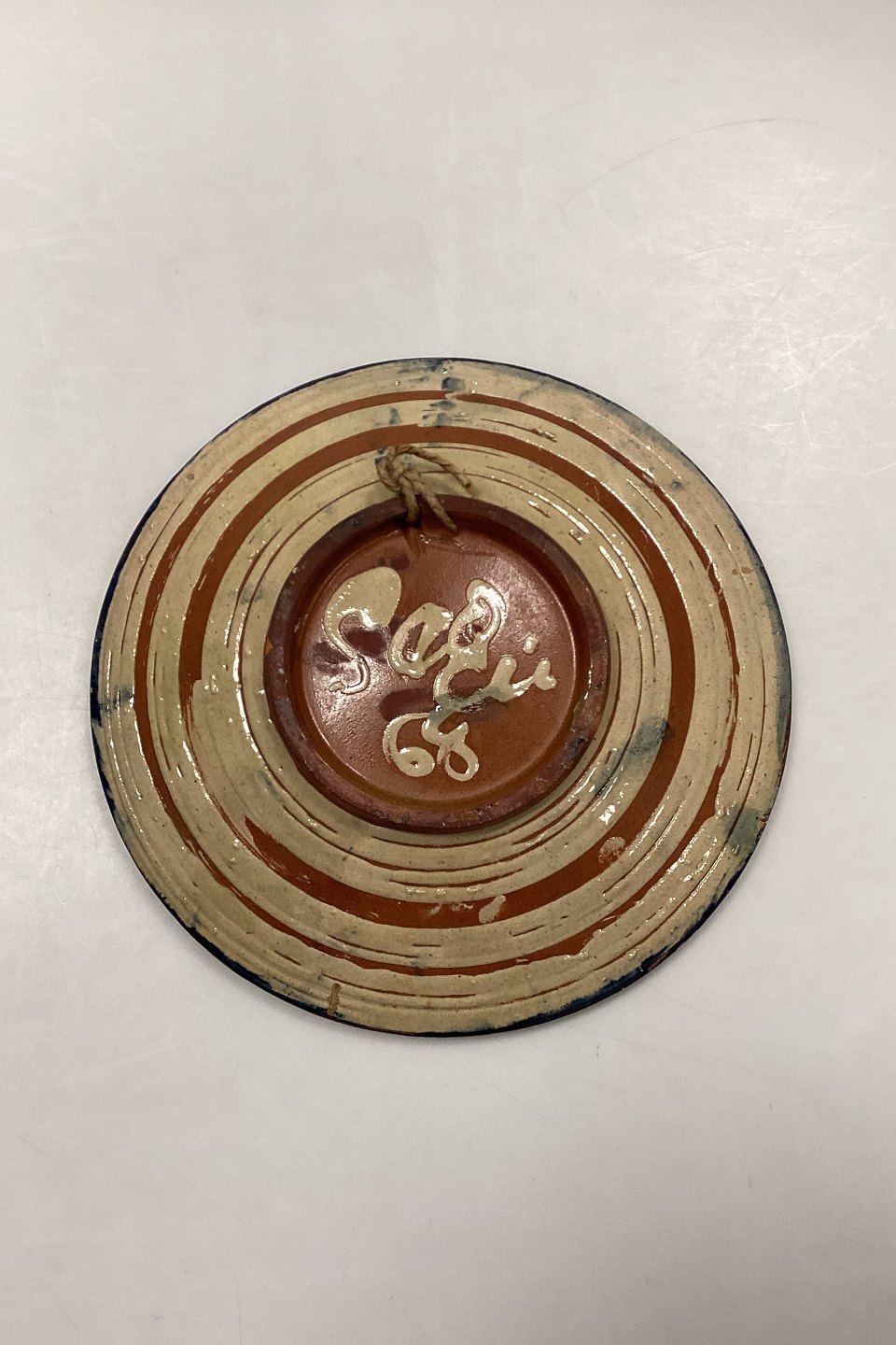 Multicolored Stoneware Dish with hole for wall hanging. Artist unknown. Possibly signed Saqú 68. Measures 23.5 cm x 4 cm / 9.05 in. x 1.57 in.