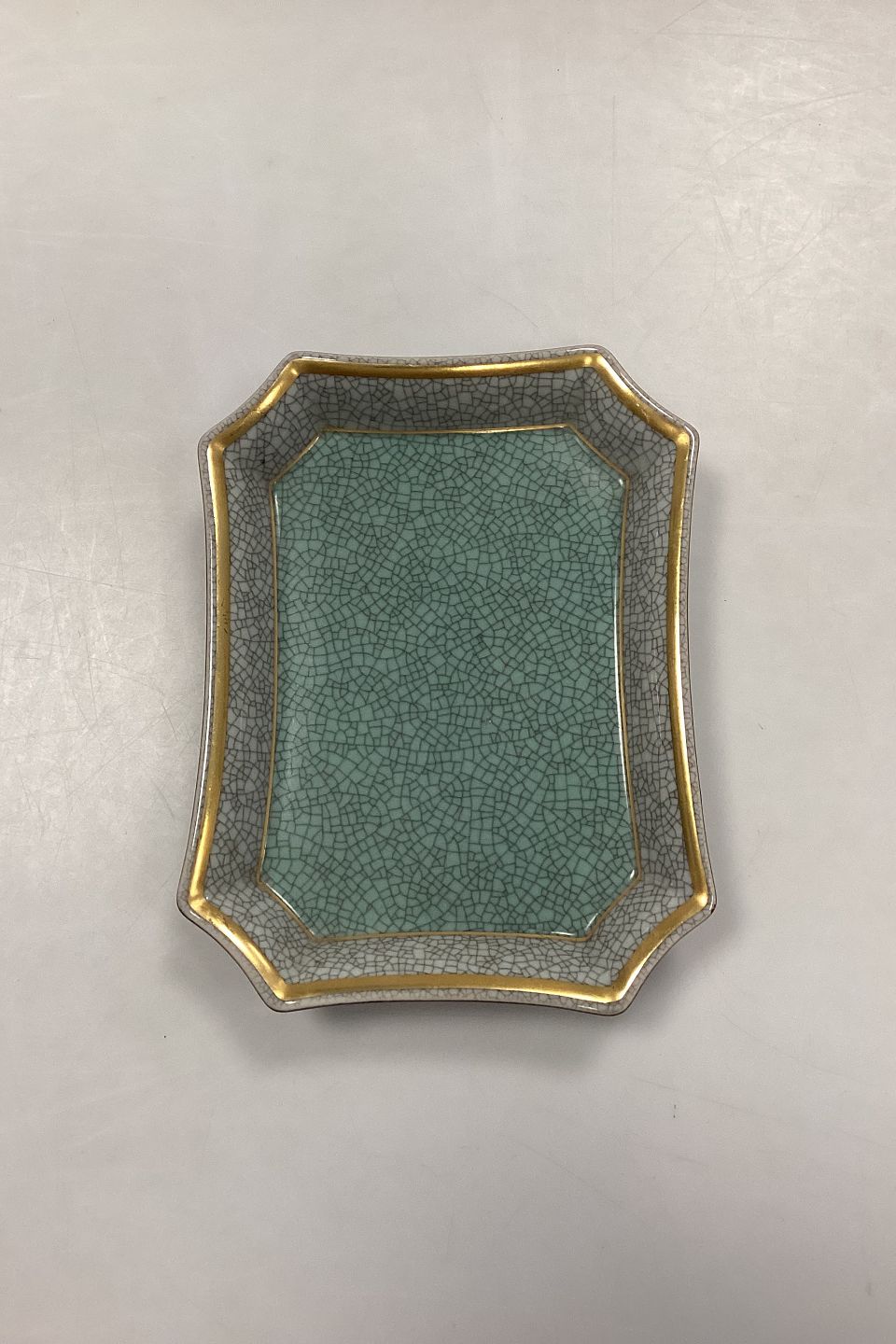 Royal Copenhagen Ottekantet Craquelé Skål med dekoration i grøn, guld og grå. 1.Sortering. Måler 13 cm x 17 cm / 5,11 in. x 6,69 in.