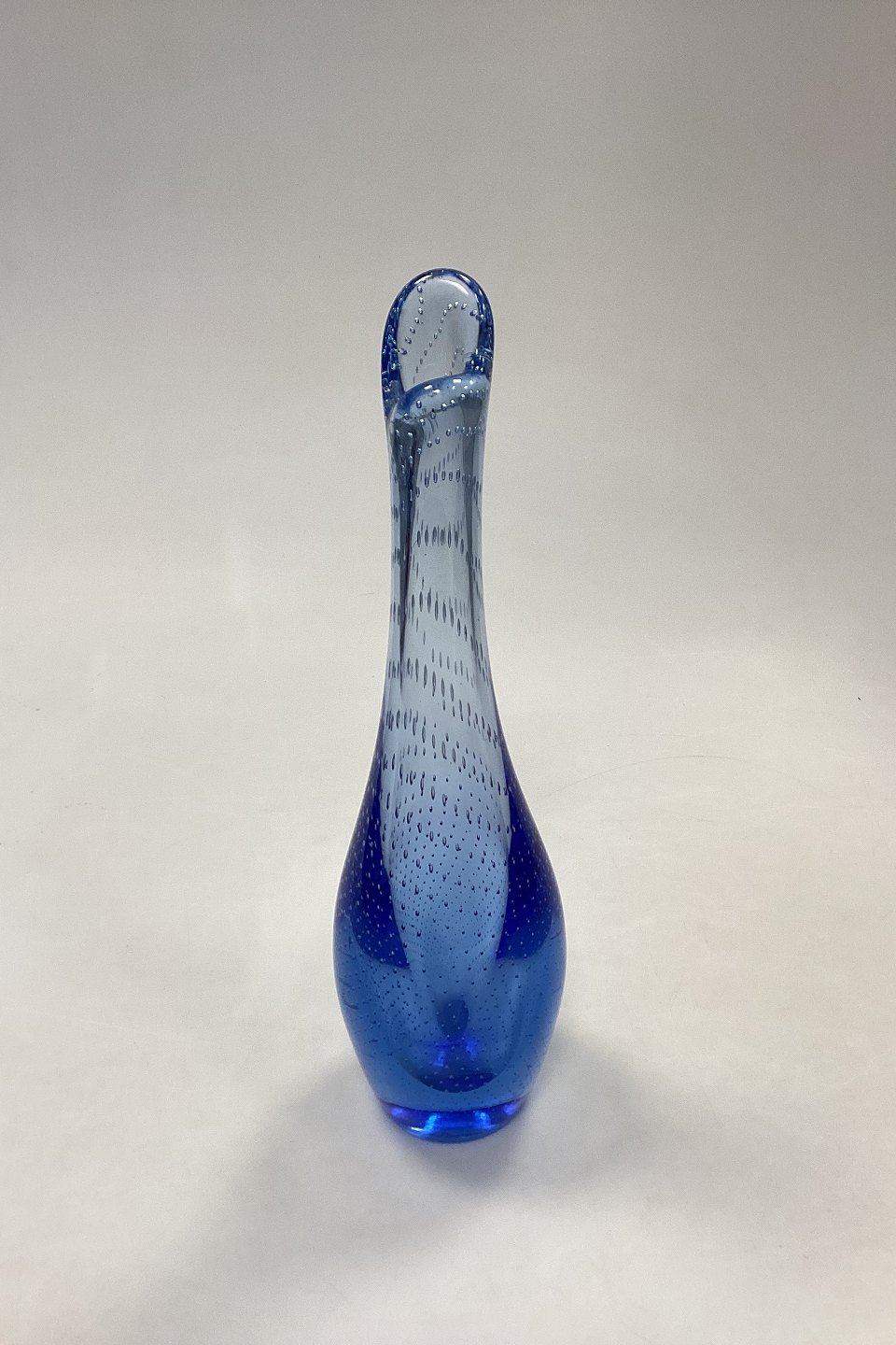Holmegaard Lyseblå Duckling / Næb-Vase med Bobler. Designet af Per Lütken fra 1952-1974. Måler 29,5 cm / 11,6 in. En 7 mm / 0,27 in. Lille idse midt på, og en boble i overfladen.