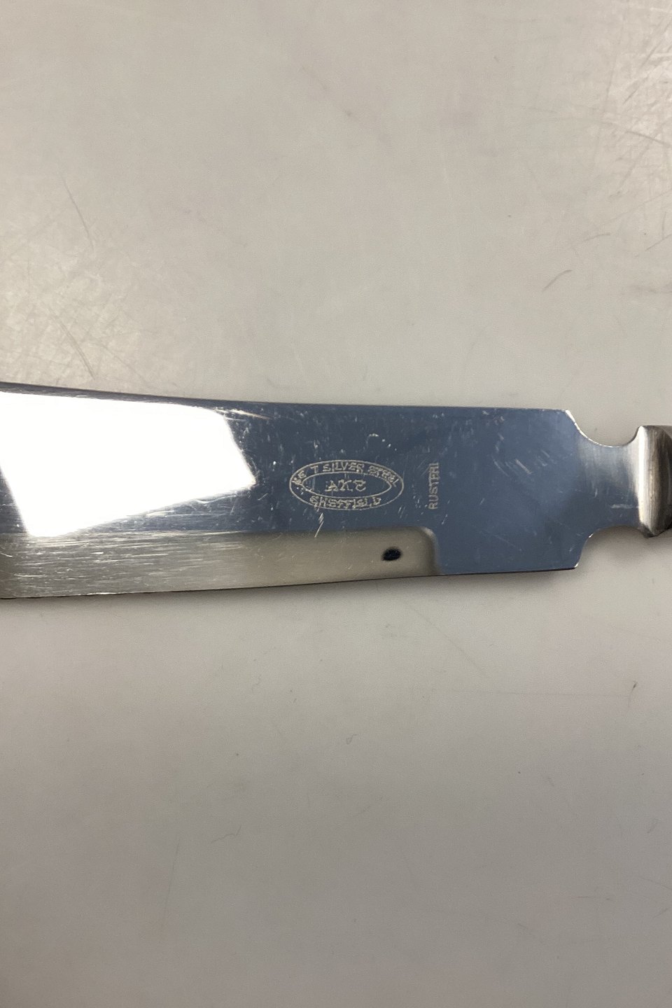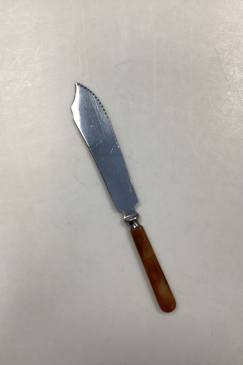 Stainless Sheffield Cake Knife with blade and amber bakelite handle. Measures 26.5 cm / 10.43 in. In very good condition.