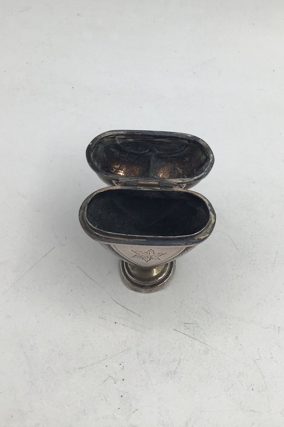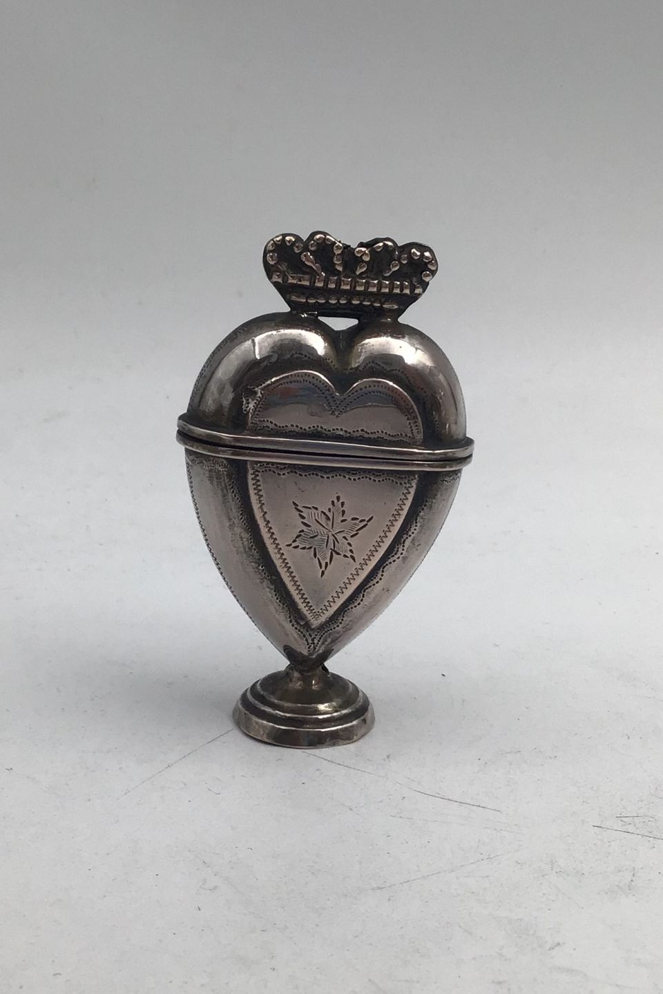 Dansk? Sølv Hovedvandsæg Hjerteformet med Krone Måler H 7.5 cm (2.95 inch) Bredde 4.5 cm (1.77 inch) Vægt 22.9 gr (0.81 oz) (Utydeligt stemplet) Brugsspor