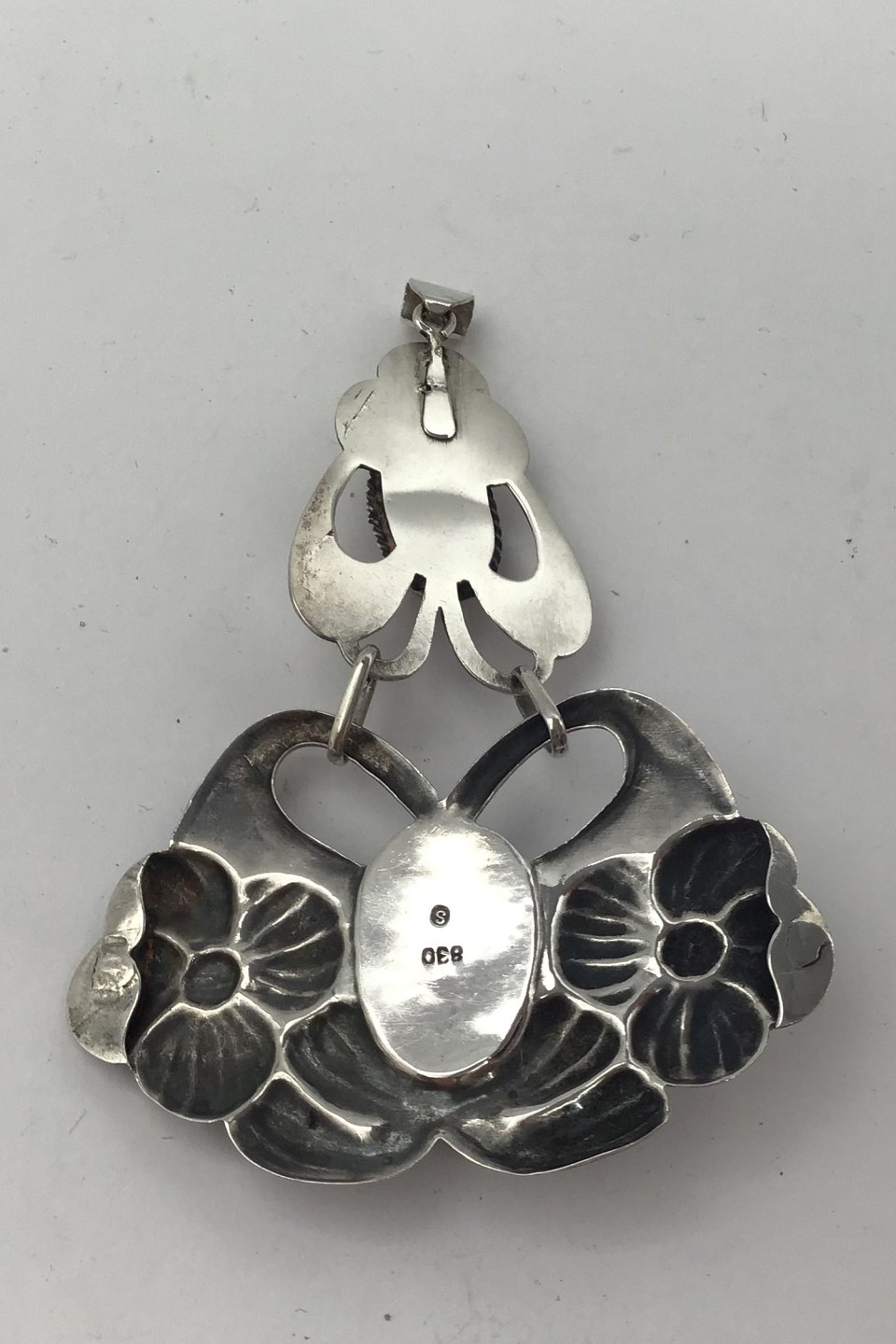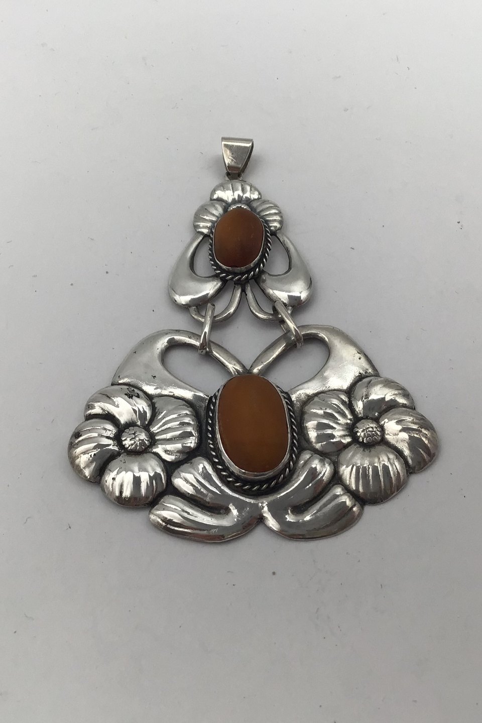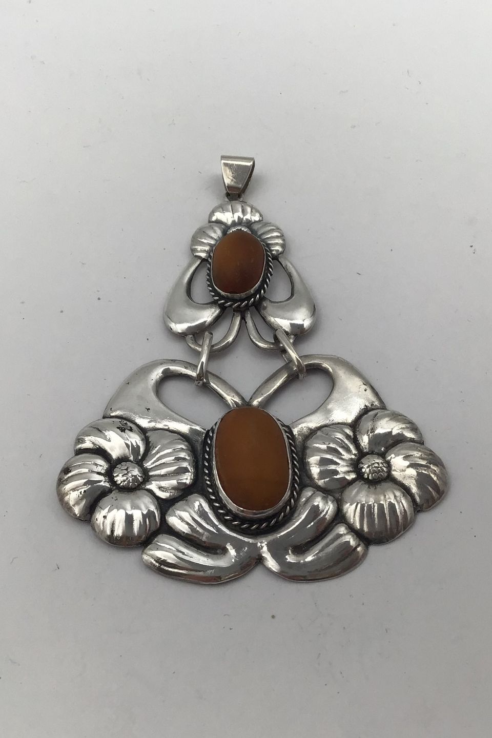 Danish Silver Art Nouveau Pendent with Amber Measures 9.2 cm x 6.3 cm (3.62 inch x 2.48 inch) Weight 15.8 gr (0.56 oz) (Redesigned brooch)