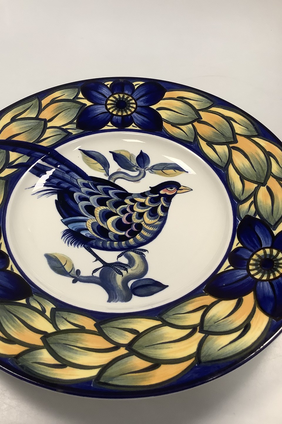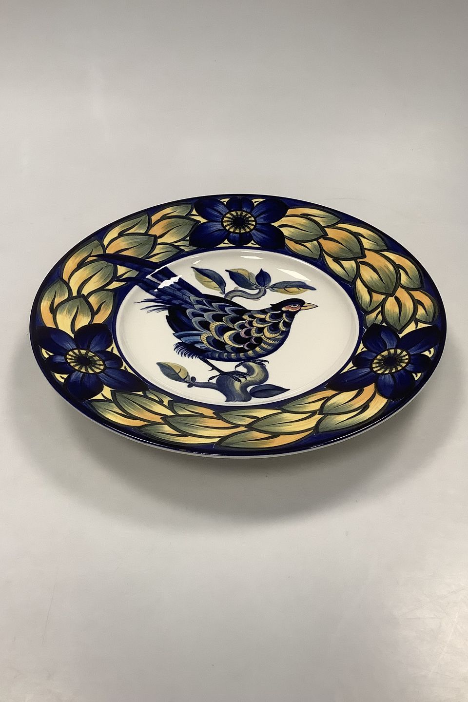 Blue Pheasant is a faience dinnerware service. The decoration dates back to the early 20th century when people appreciated and cherished nature, just as the present generation does now. The decoration was created by Christian Joachim (1870-1943), he was the artistic driving force in the renewal of Danish faience around the turn of the century. Danish faience has become a treasured cultural heritage, characterized by generous, sweeping shapes and liberally applied decorations in exuberant colors. In 1990 Royal Copenhagen reproduced the decoration to a dinner service. Blue Pheasant is dominated by an imaginary bird in blue and yellow in a style that is very characteristic of Joachim's work. Faience is fired at rather low temperatures, and this makes it possible to use many different colors. The fine faience glaze produces a special dept of color and refraction that give the colors intensity and luster.