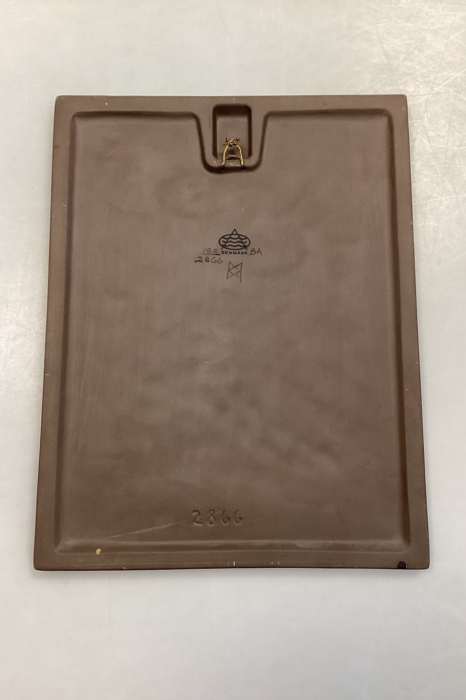 Royal Copenhagen/Aluminia Relief i stentøj No. 162/2866. Designet af Beth Breyen. To fugle i brunt og sort, på baggrund af blå og brun glasur.