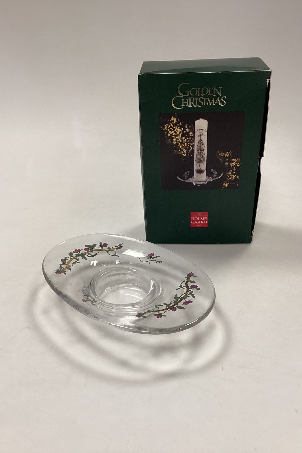 Holmegaard Golden Christmas Calendar Candlestick 2003. Flower tendrils in purple and gold. Measures 18.5 cm x 11 cm / 7.29 in. x 4.34 in.