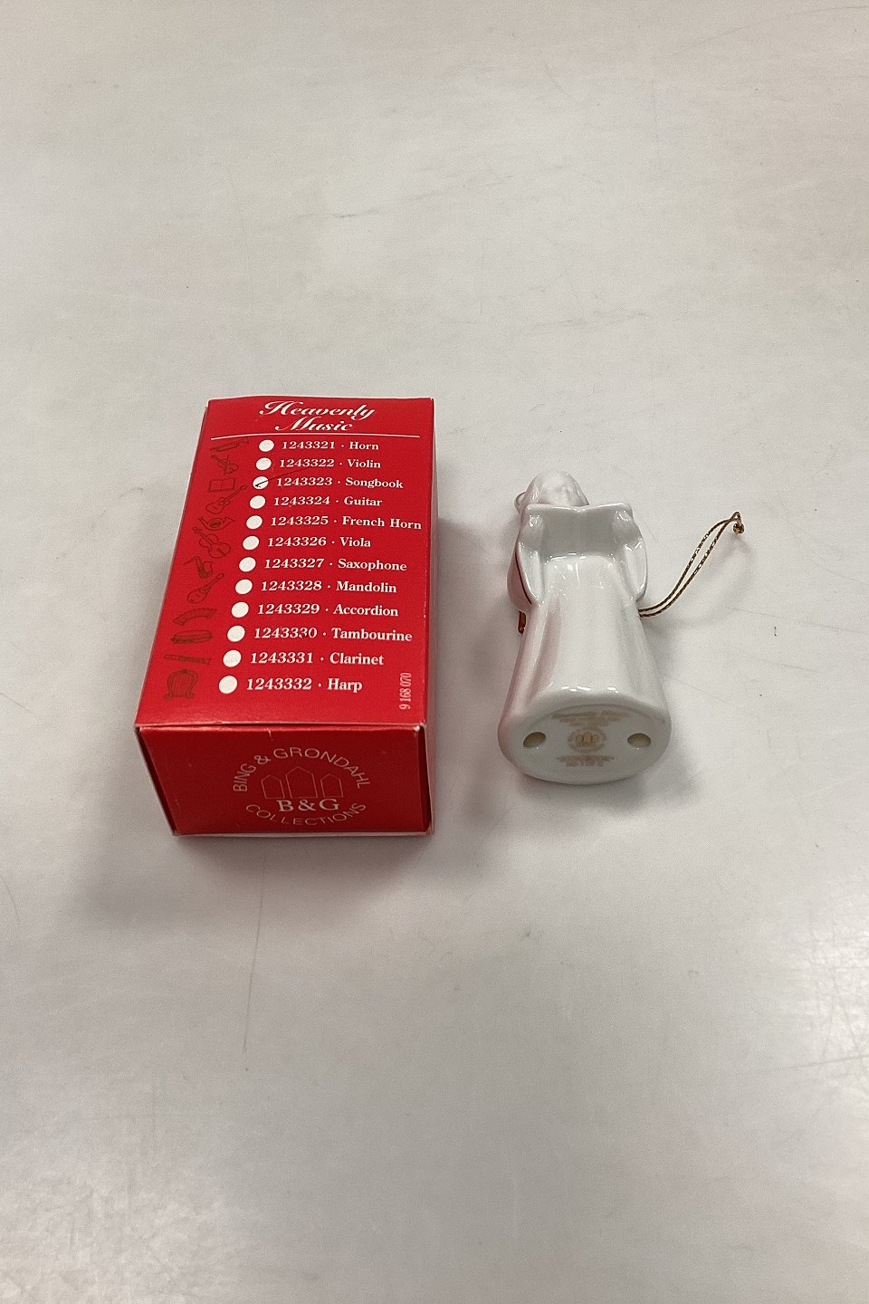 Bing og Grøndahl Figur Heavenly Music Engel - Sangbog No. 3. Juleornament i blanc de chine porcelæn med guld og snor til ophæng. Måler 9,5 cm / 3,74 in.