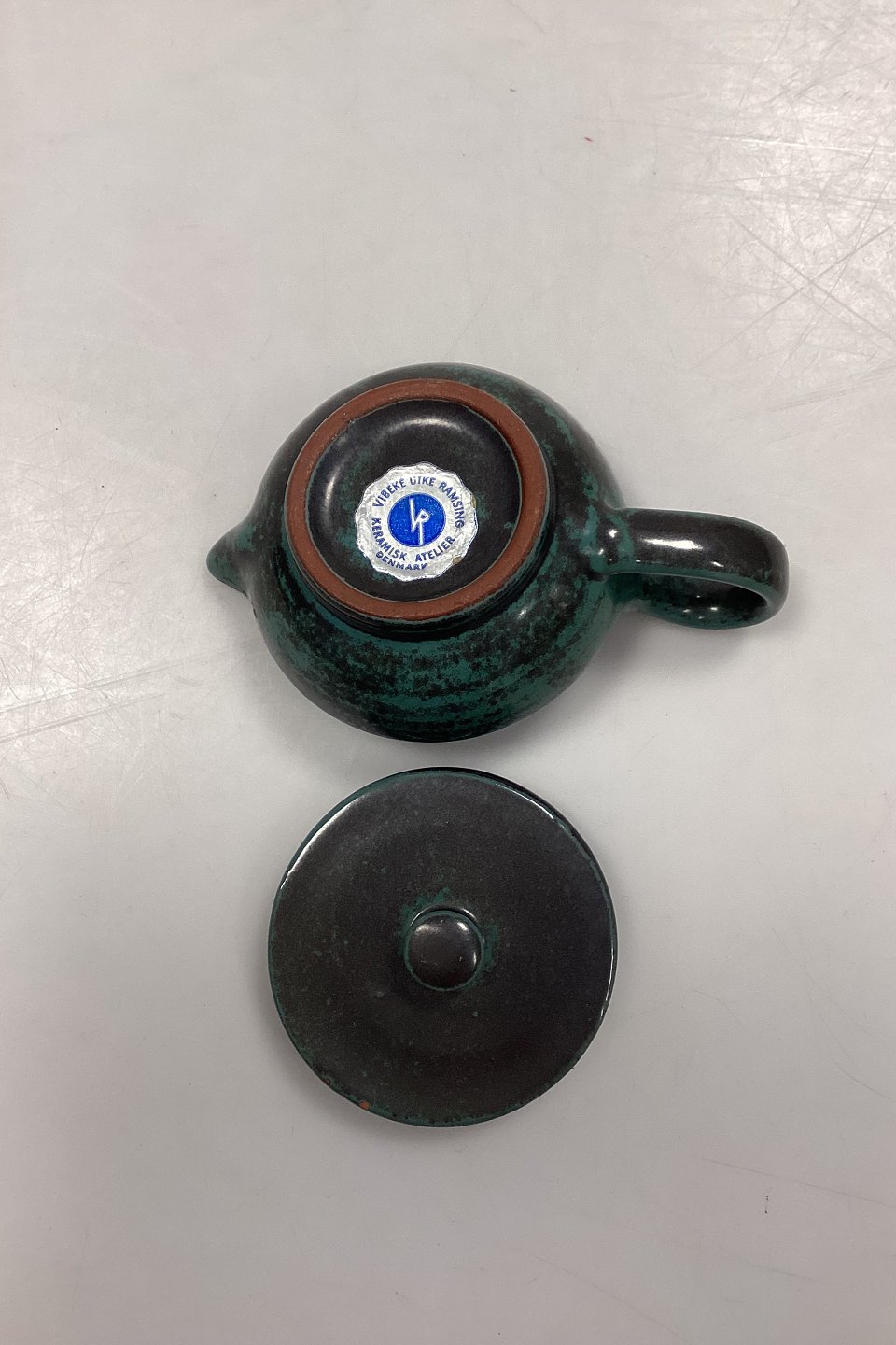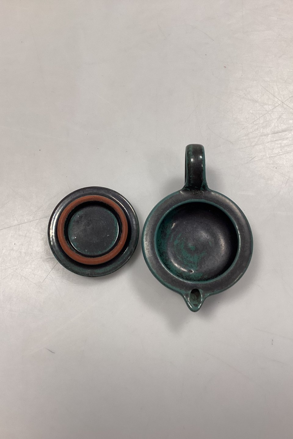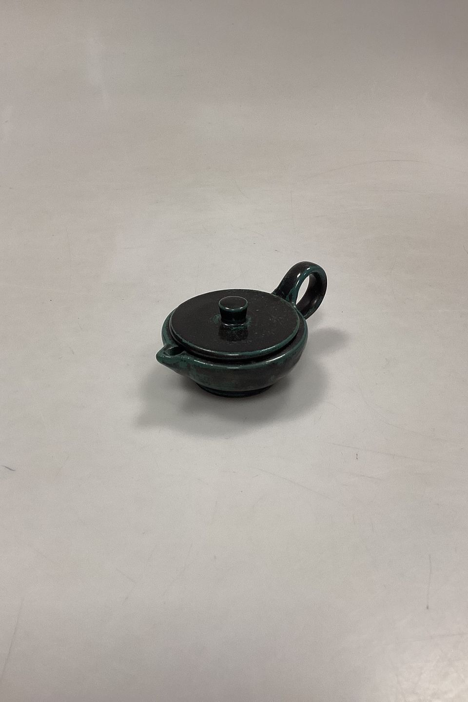 Small oil lamp in green/black ceramic. Designed by Vibeke Utke Ramsing. Measures 10.5 cm x 4.5 cm / 4.13 in. x 1.77 in. Micro chip on the lid.