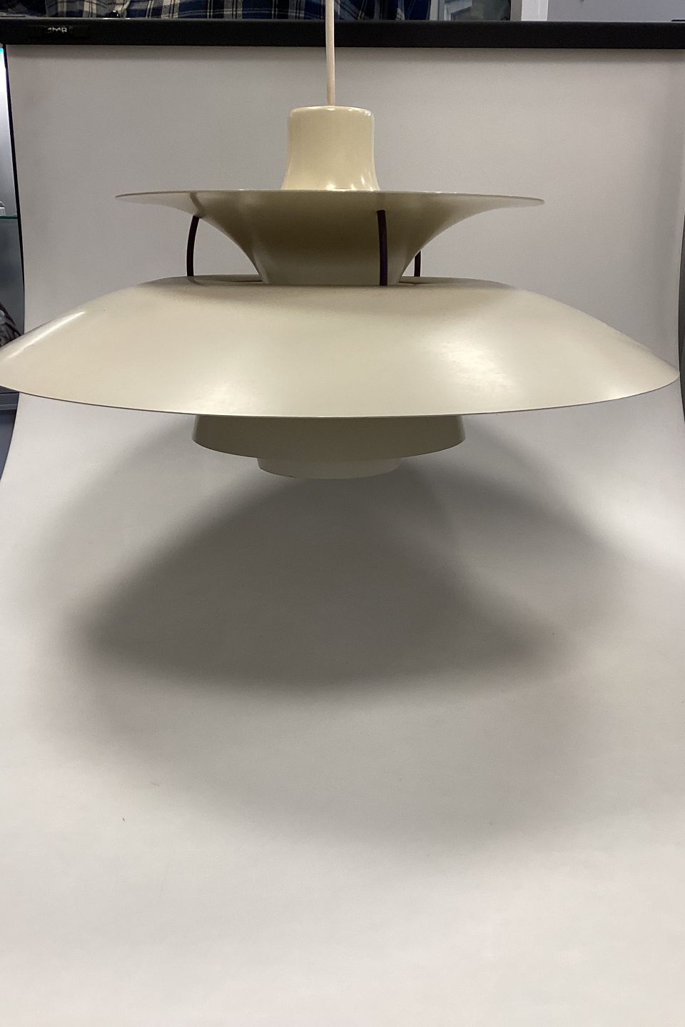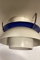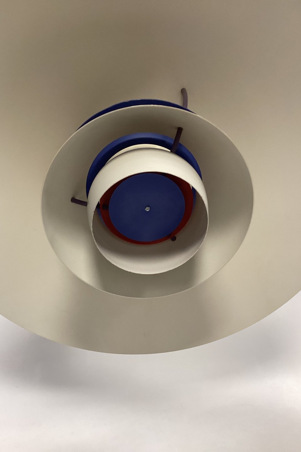 Poul Henningsen for Louis Poulsen White pendant PH 5. Blue and red inner shade. Small dent on the blue shade, see photo. Measures 50 cm x 26.7 cm / 19.68 in. x 10.51 in.