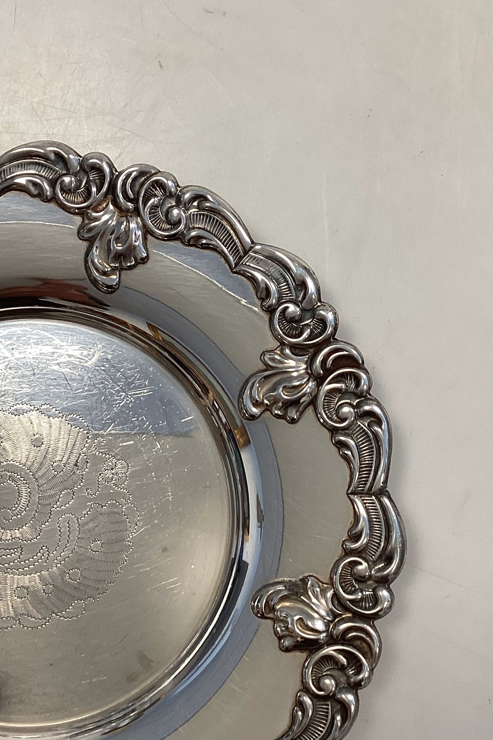 Danish Holger Noersgaard Silver Plated Bottle Tray. Beautifully crafted edge decoration. Engraved decoration on the top surface. Measures 17.8 cm / 7 inches