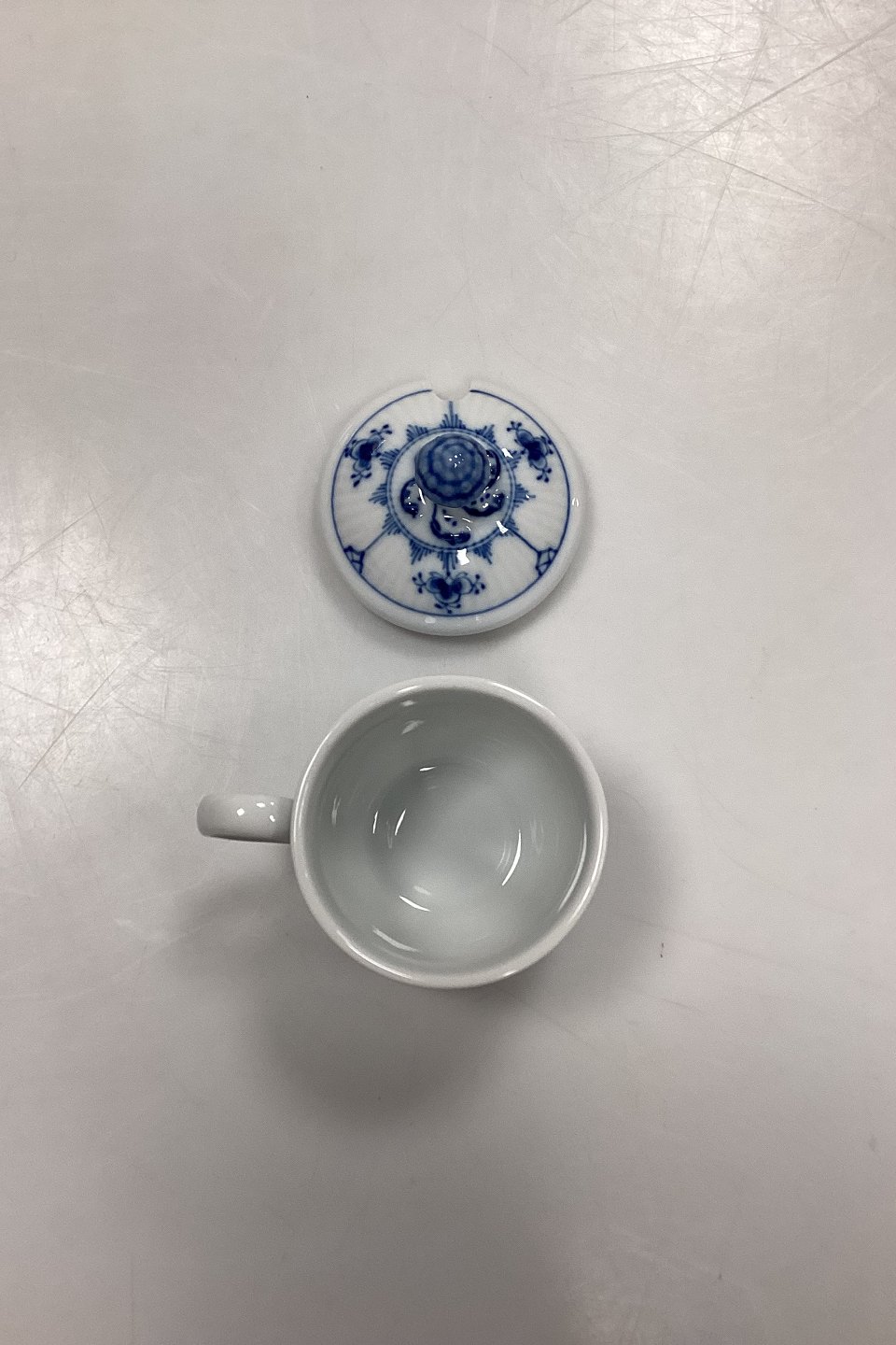 Royal Copenhagen Musselmalet Riflet Sennepskrukke / Cremekop med låg No. 200 med låg No. 199.