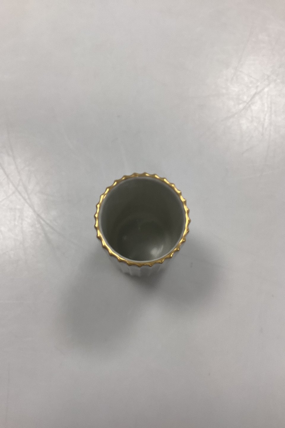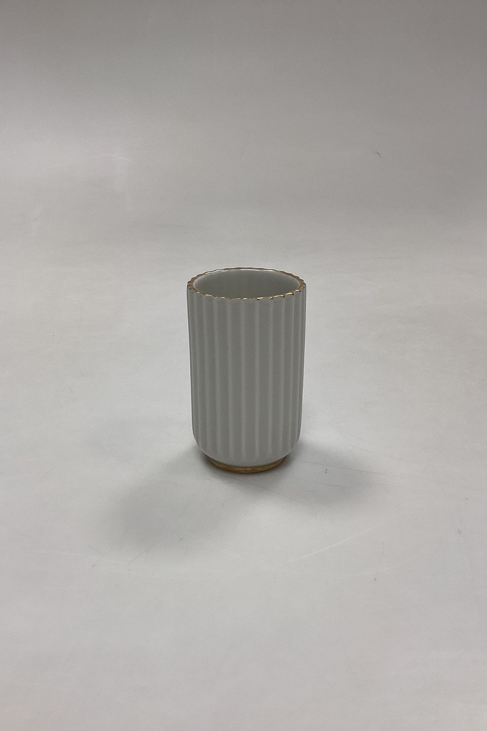 Lyngby Vase, lille. Hvid rillet form med guldkant. Måler 8 cm / 3,15 in.