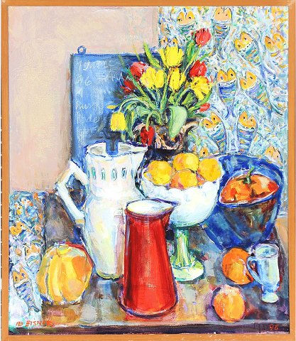 "Opstilling med blomster og kander"flot lyst oliemaleri.