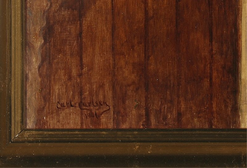 "På verandaen" Sommerlandskab med udsigt gennem have dør. Olie maleri på lærred.