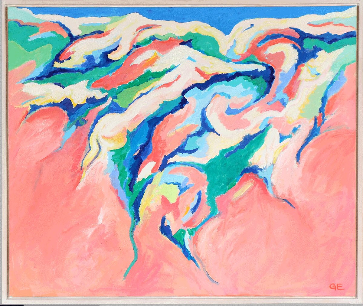 "Lysformer" Olie maleri på lærred i hvid svæve ramme.