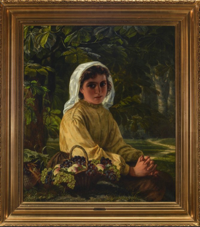 "Pige med frugtkurv i skoven" Olie maleri på lærred.