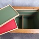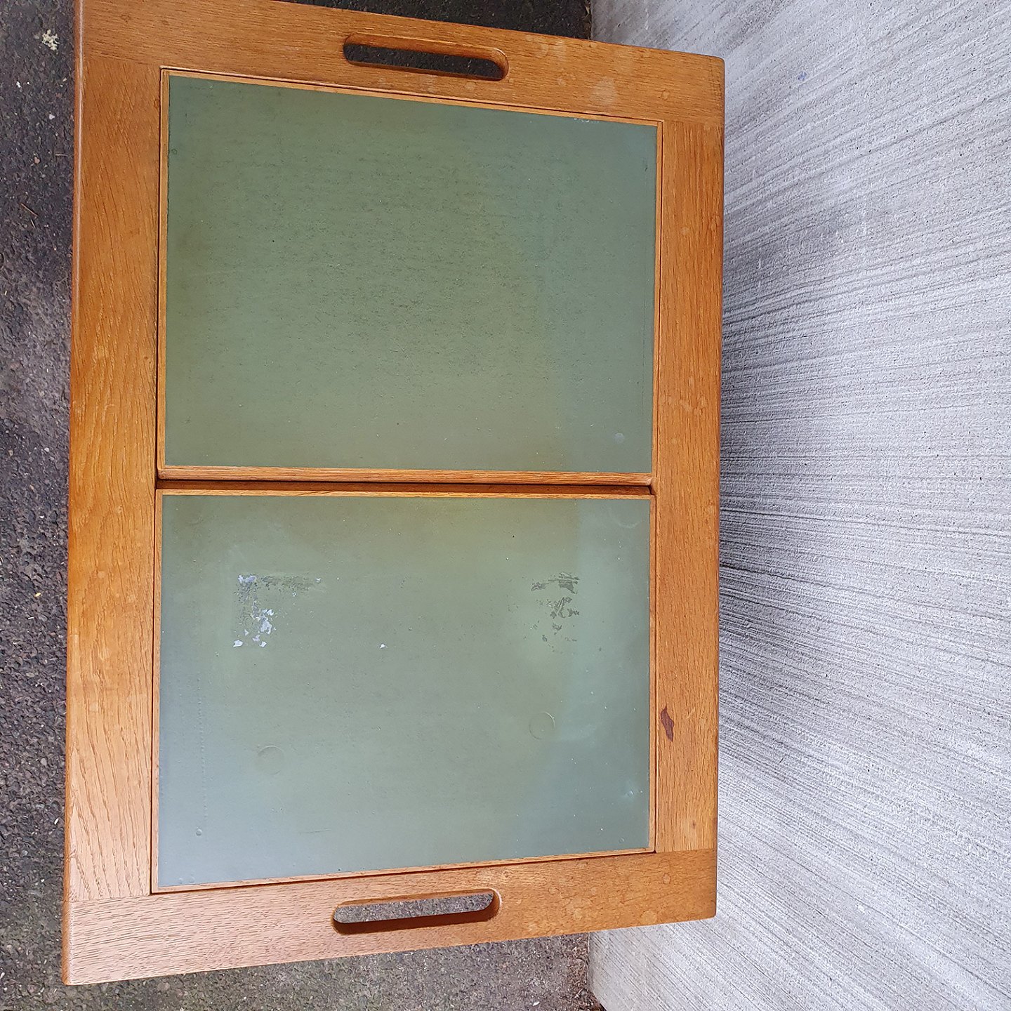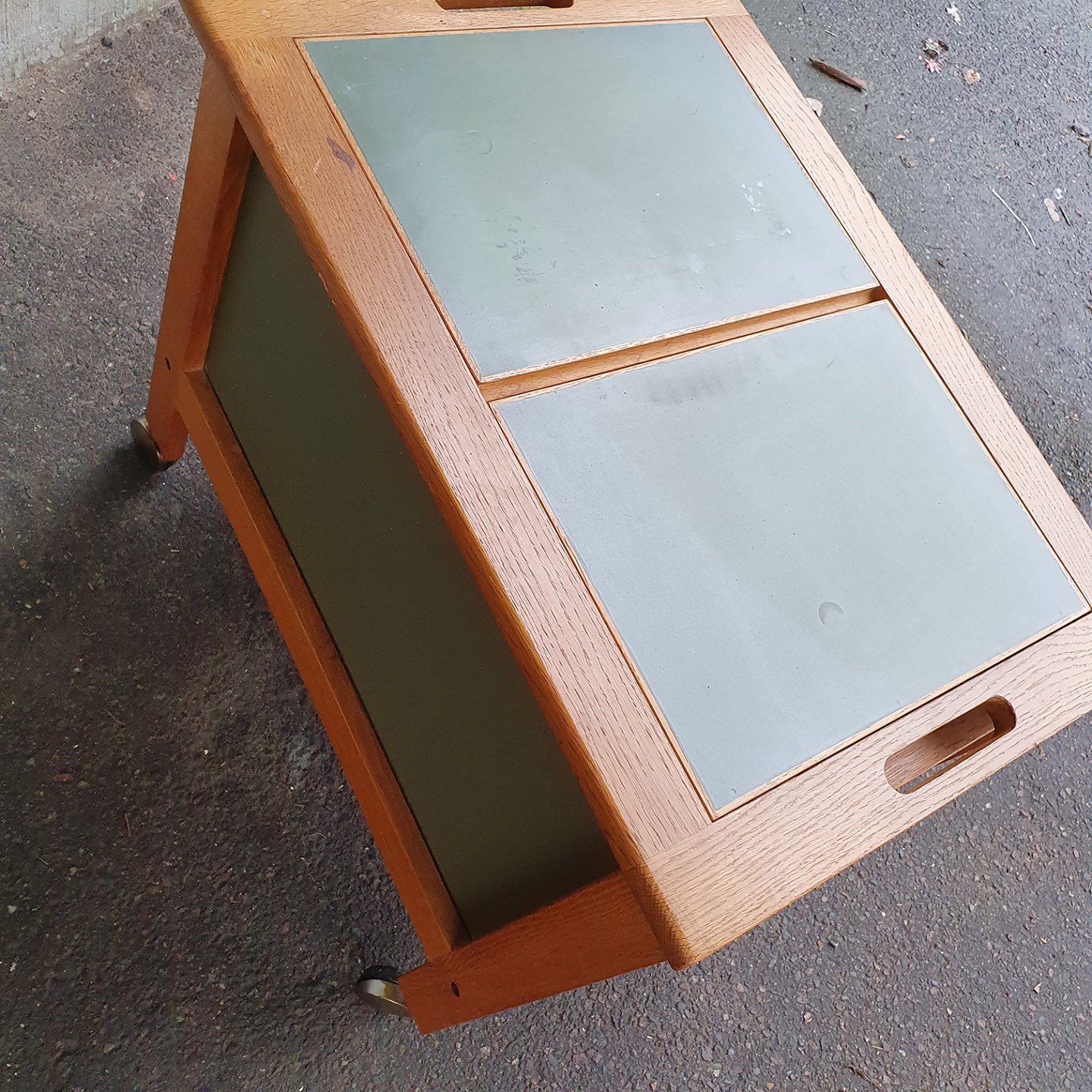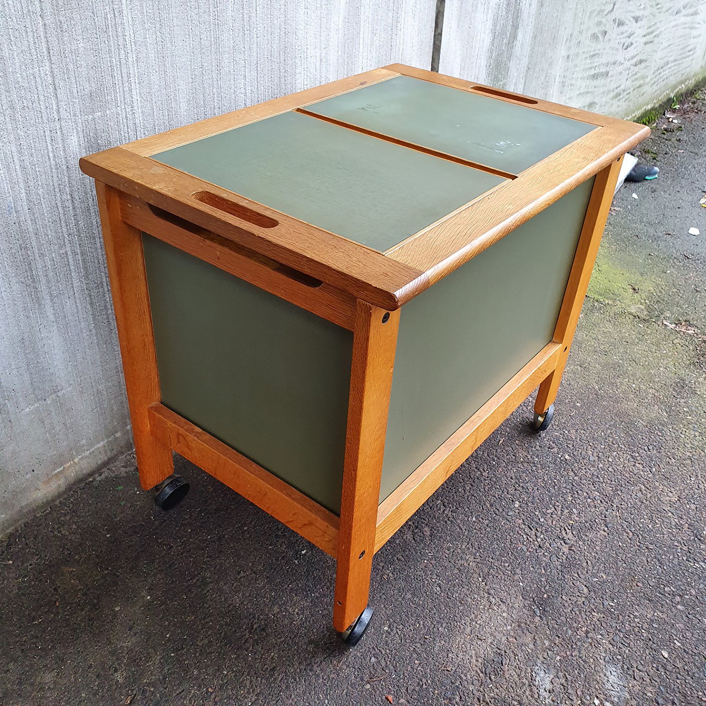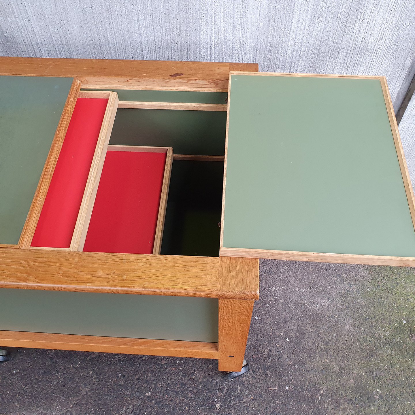 Barskab på hjul af egetræ og grøn laminat.Indvendig med bakker i massiv eg og rød og grøn laminat. Ikke identificeret designer/producent.God stand.