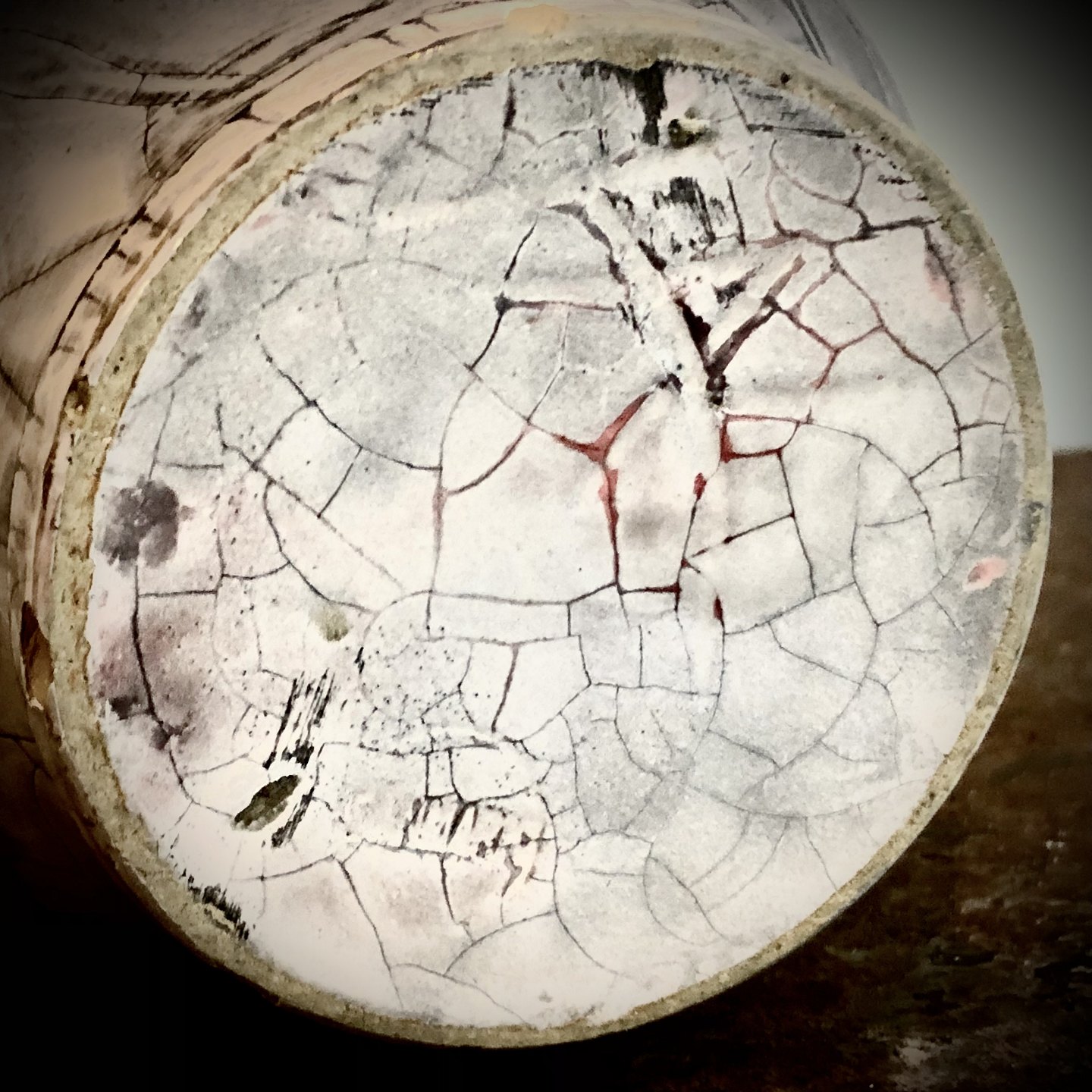 Käler kande med hvid askeglasur H.13 cm. Ø 13/20 cm cm. Fremstår med små chip på bundran. Inridset HAK i Bunden.