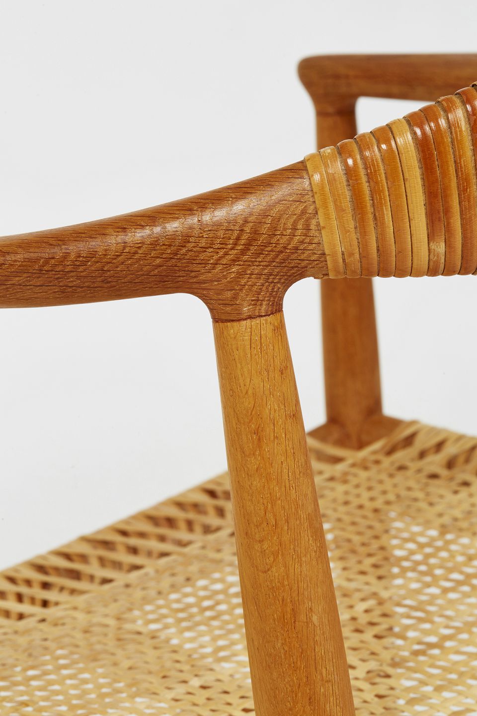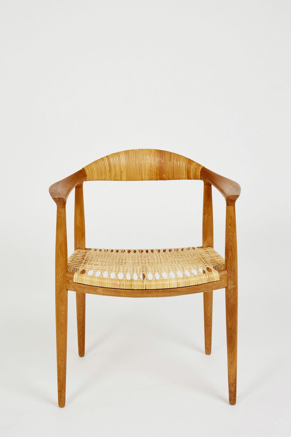 Hans J. Wegner Armstol, model JH-501 'Den Runde Stol'/'The Chair'/‘kennedy stolen’ med stel af massiv egetræ. Sæde og ryg monteret med flet.