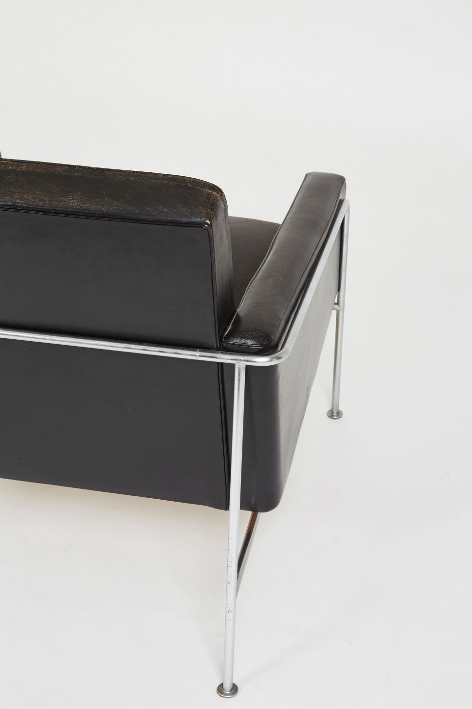 Arne Jacobsen. Lufthavnsstol i originalt sort patineret læder, stel af forkromet stål.Udført i tresserne.