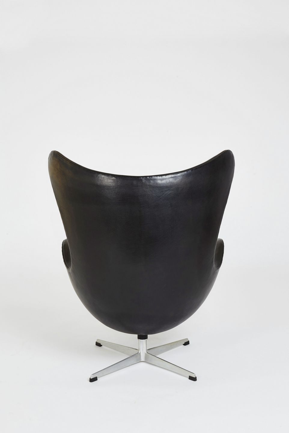 Stolen er betrukket med originalt patineret sort læder, monteret på drejelig midtersøjle samt helstøbt profileret fod af aluminium. Fremstillet hos Fritz Hansen , Formgivet i 1958-59 som en del af totalindretningen i Hotel Royal København.