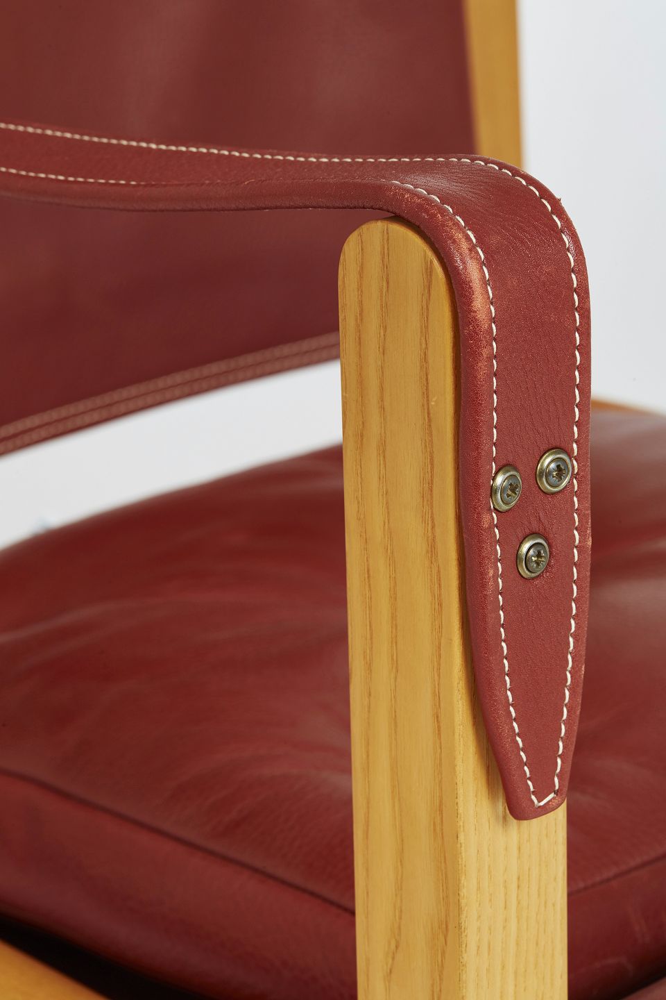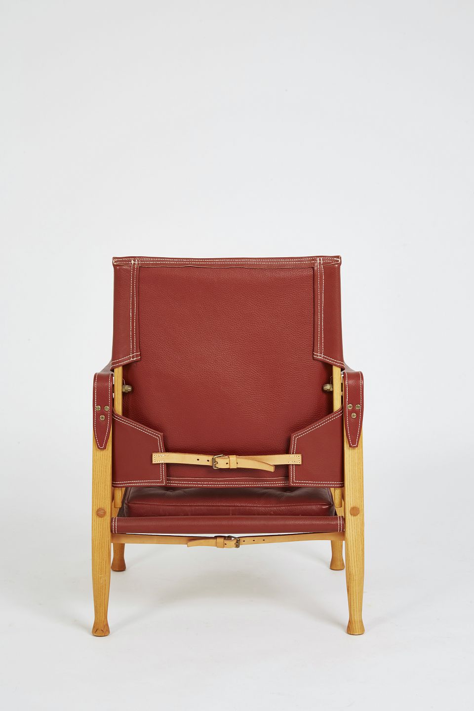 Kaare Klint. Safaristol med stel af asketræ. Sæde, ryg, armlæn og knapsyet hynde betrukket med rødbrun læder.