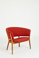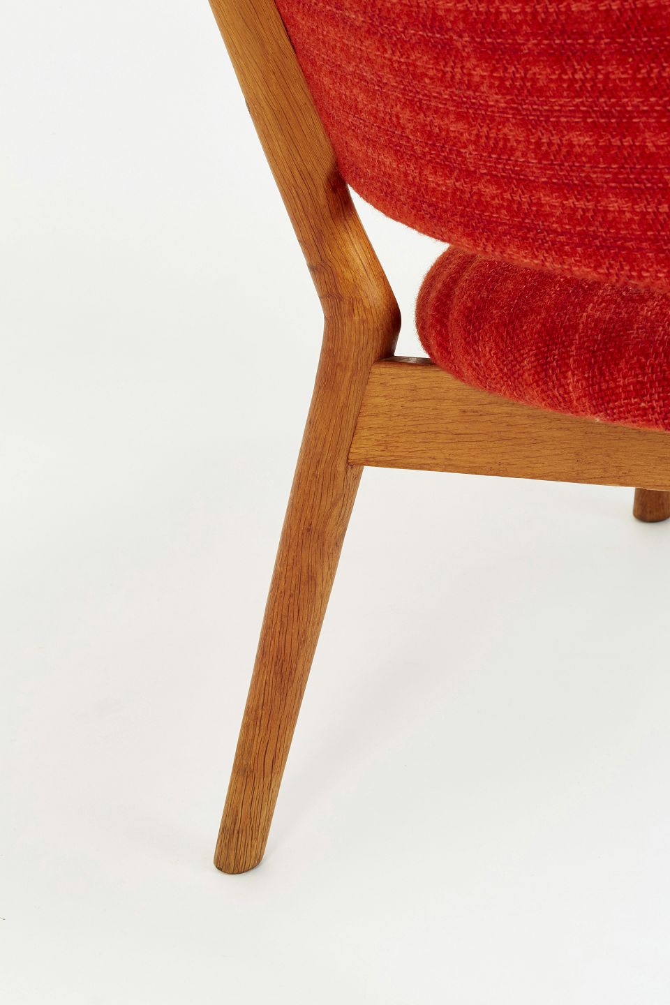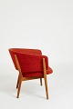 Nanna Ditzel. Armchair with patinated oak frame, curved backrest and seat, upholstered in original red-orange checkered wool . Designed 1952. Made by Søren Willadsen, model ND 83. This exampel from 1960. Extremly good original condition.