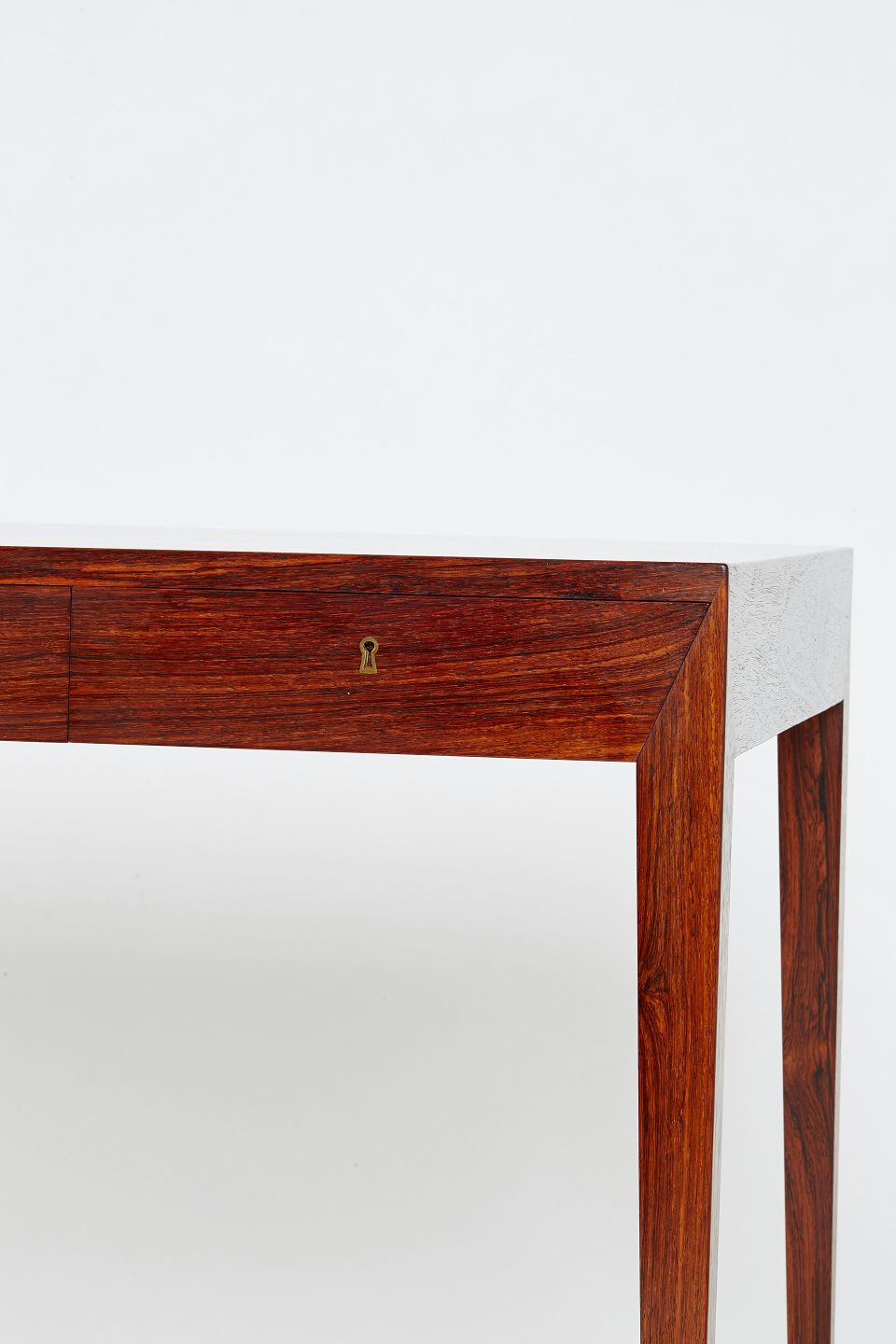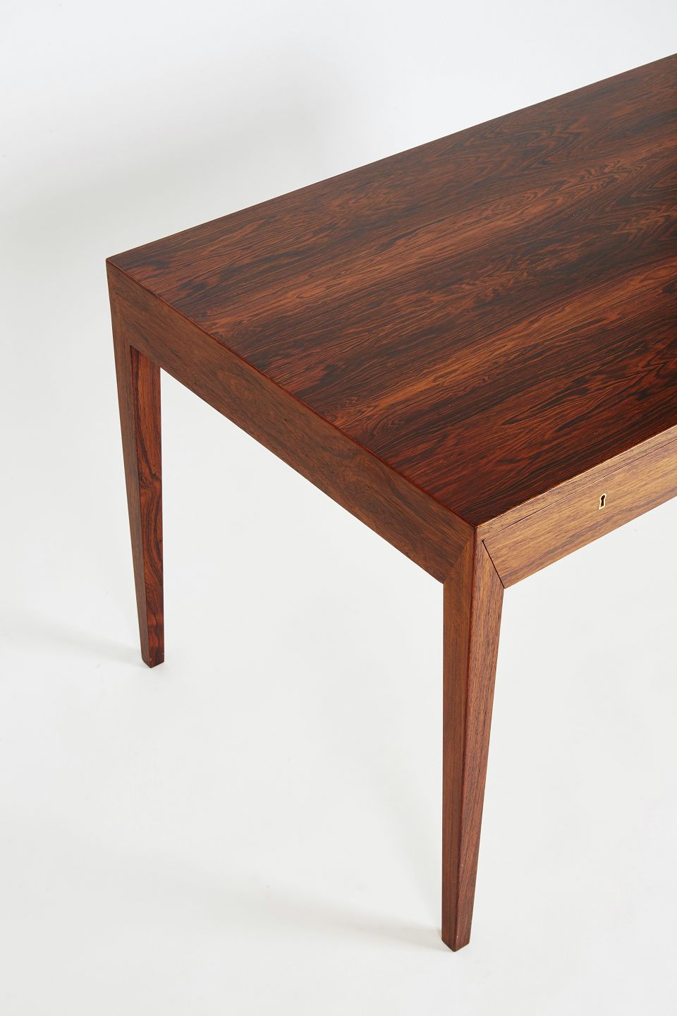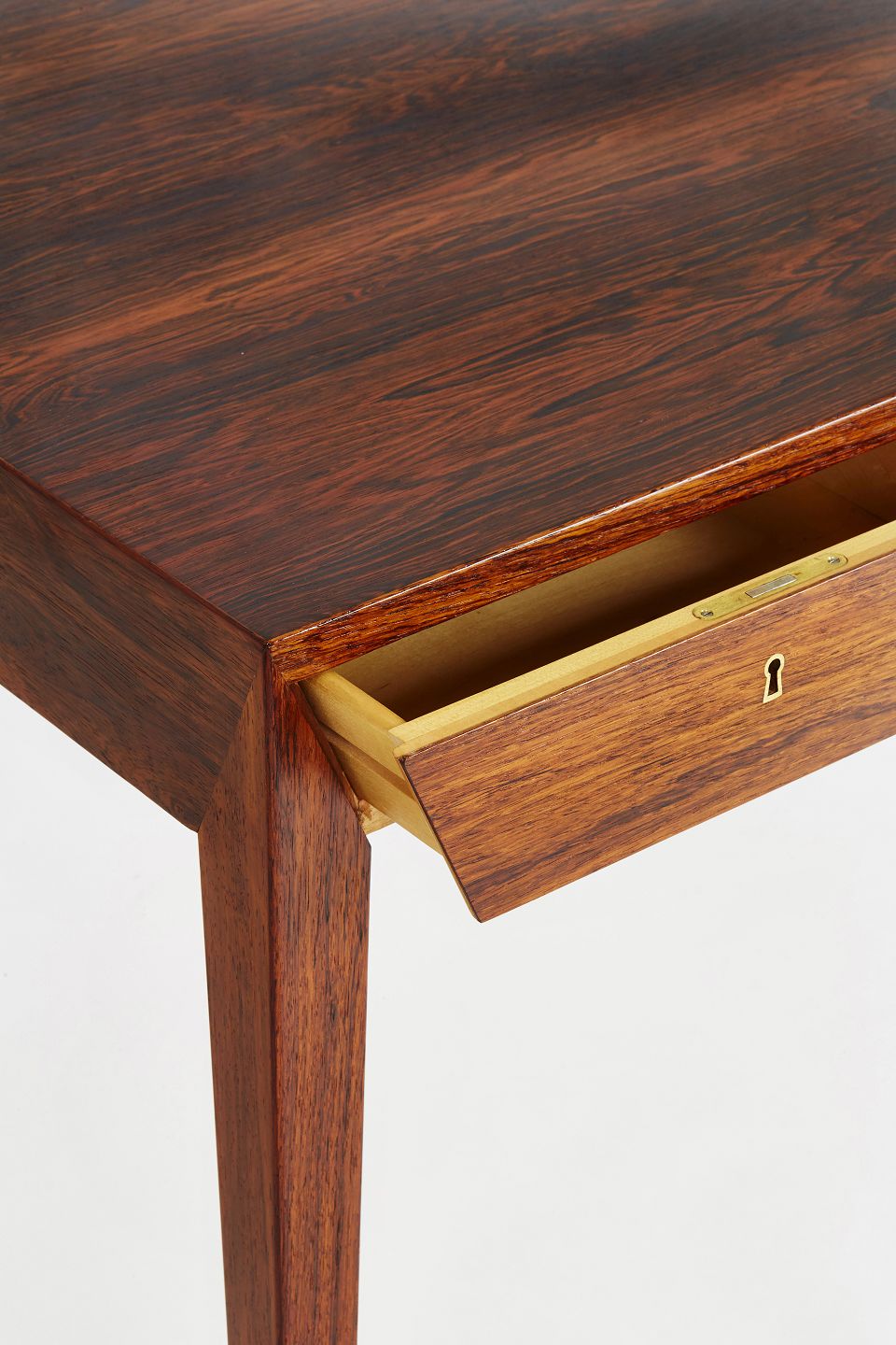 Severin Hansen Junior. Freestanding rosewood desk. Front with four integrated drawers with lock, standing on tapered legs with bevelled joints, brass keyholes.