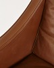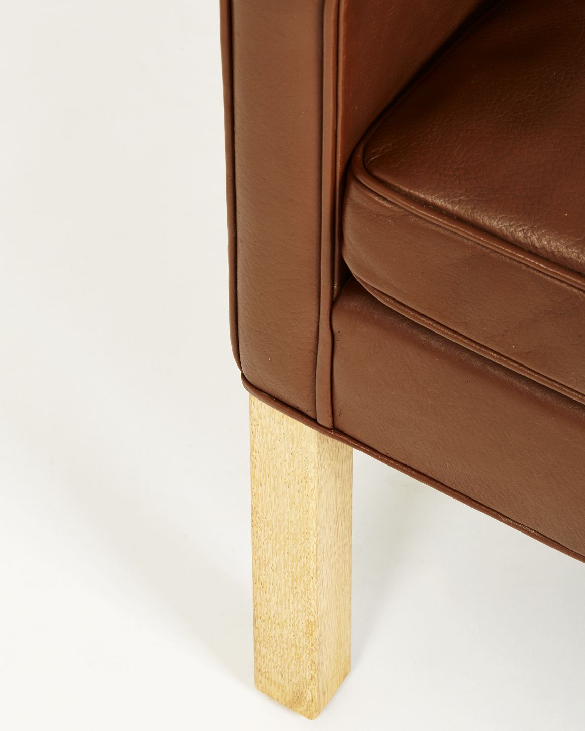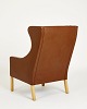 Øreklapstol med ben af lyst egetræ.Hynder med dunfyld og med originalt betræk i brunt læder. Velholdt stand med brugsspor.