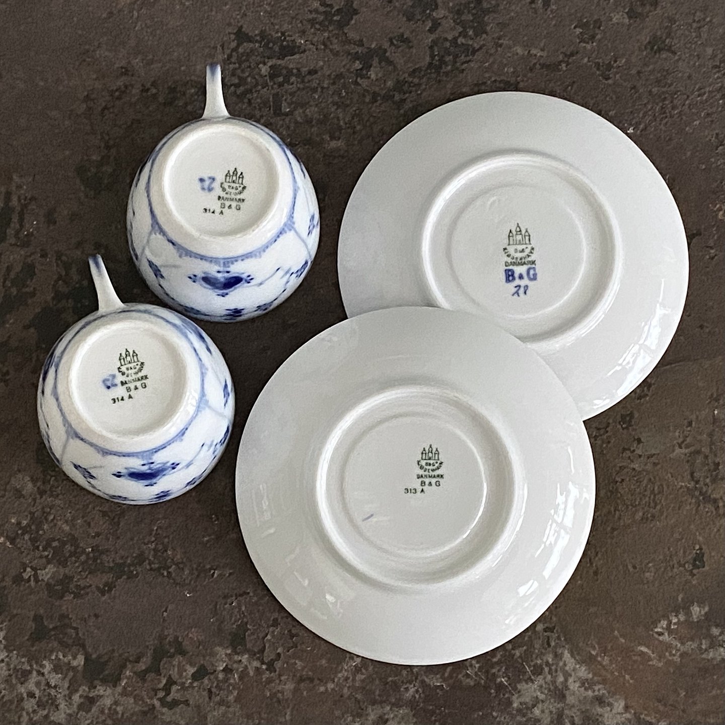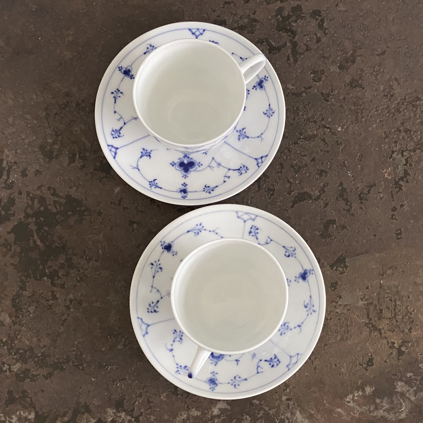 Musselmalet 2stk. Kaffekopper nr 314A samt 2stk. Underkopper nr. 113A.