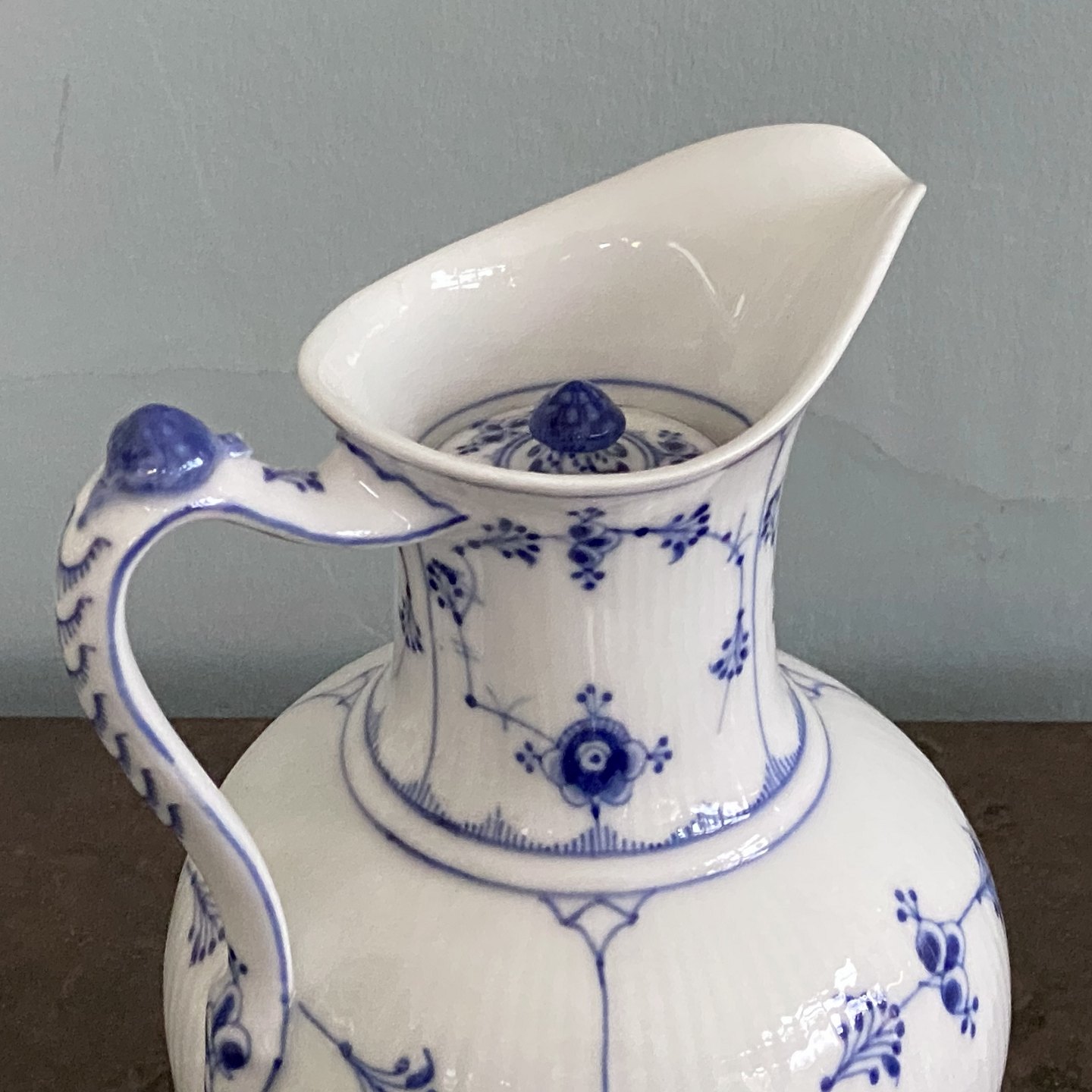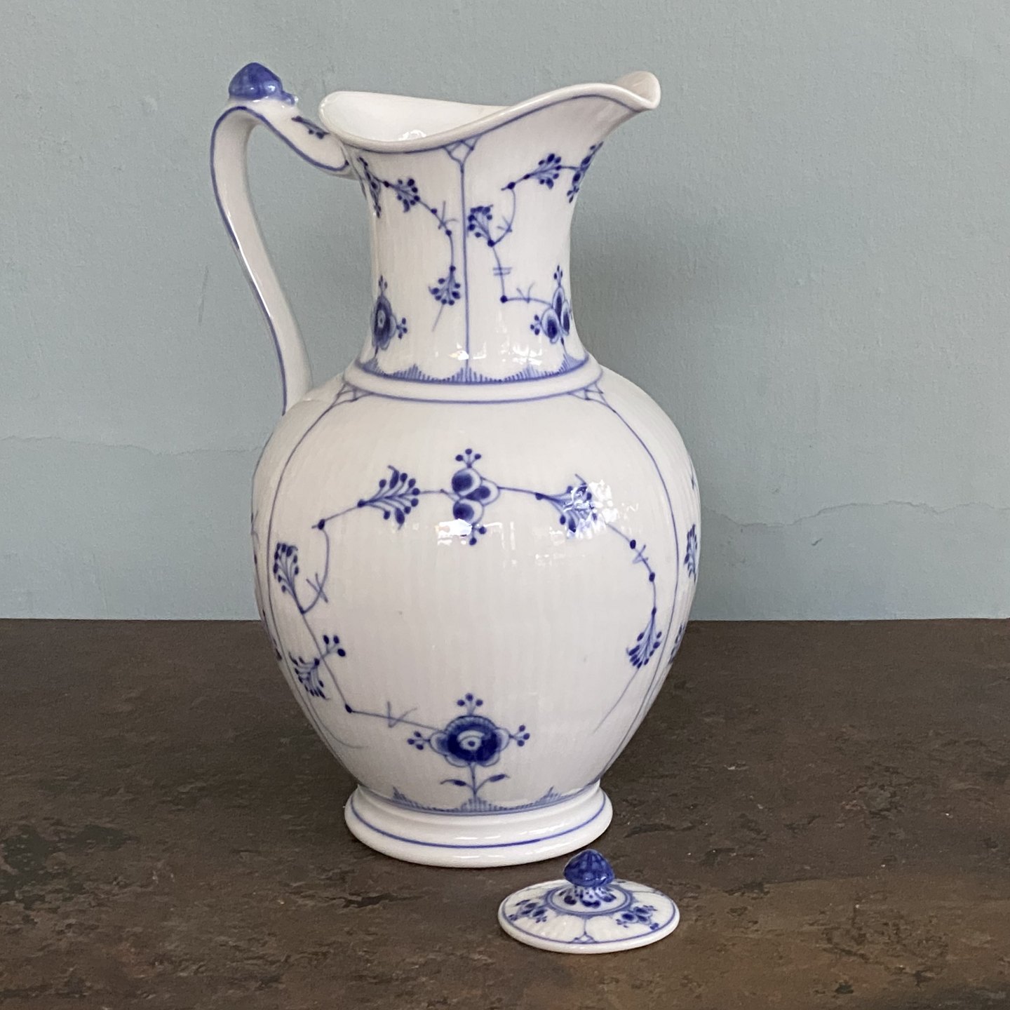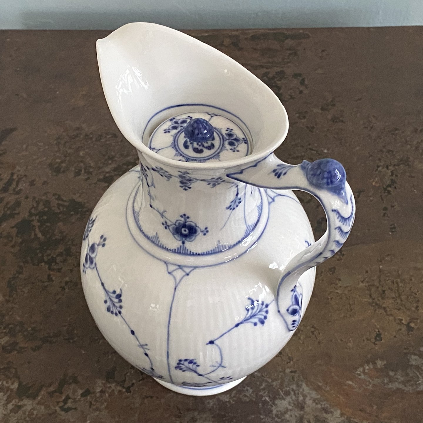 Musselmalet riflet chokoladekande nr. 482 med låg, fremstillet i år 1894-1900. 1.sort.