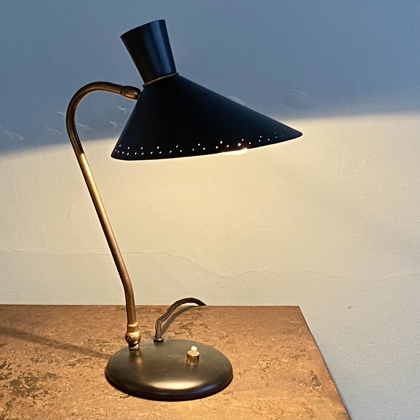 Table lamp from the 50'ties in black lacquered metal and brass. On the base there is a switch and a black fabric cord. Adjustable arm and gooseneck. Breakthrough screen.