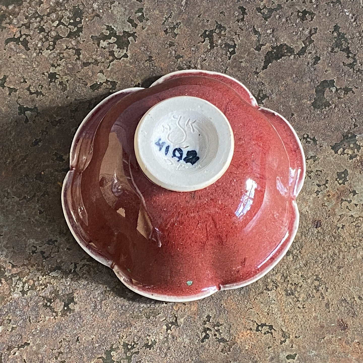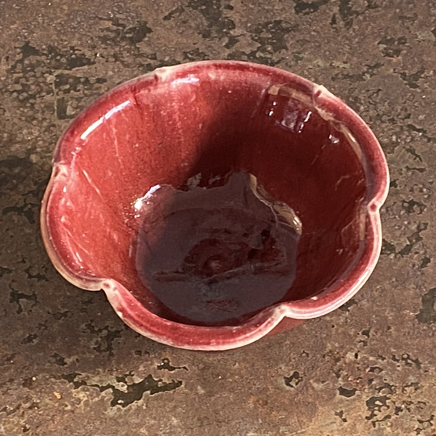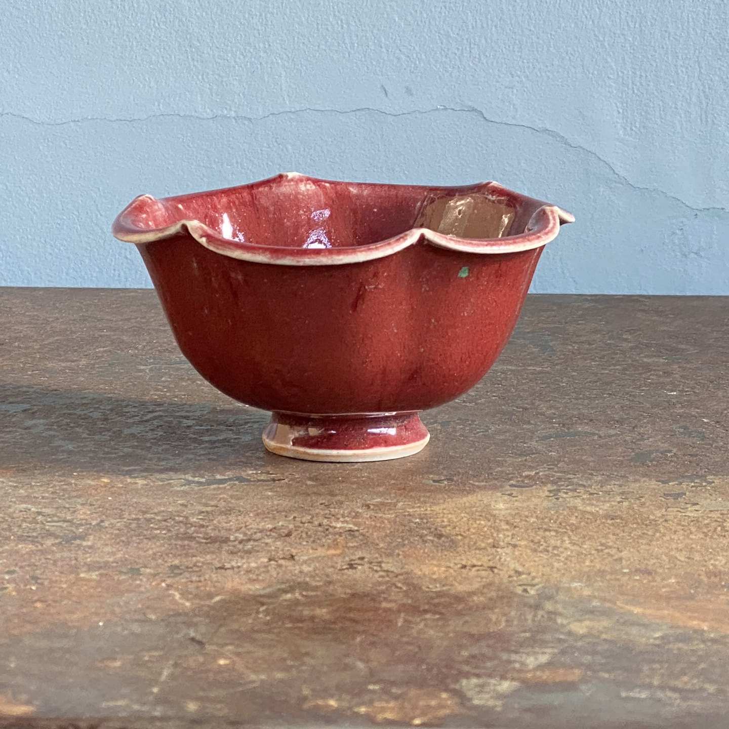Stoneware bowl with oxblood glaze. The bowl has a beveled edge and a small foot. The bottom is signed with p J k and indistinct model no. H. 6 cm. Ų 11 cm.