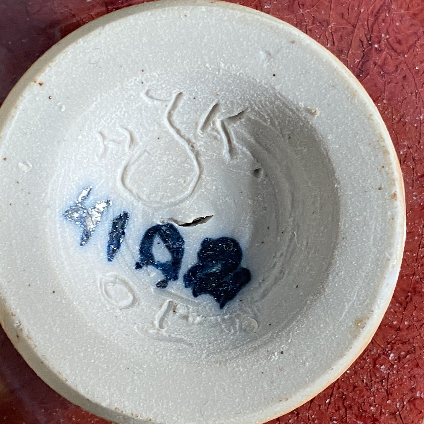Itemnumber: 530639Stoneware bowl with oxblood glaze. The bowl has a beveled edge and a small foot. The bottom is signed with p J k and indistinct model no. H. 6 cm. Ų 11 cm.