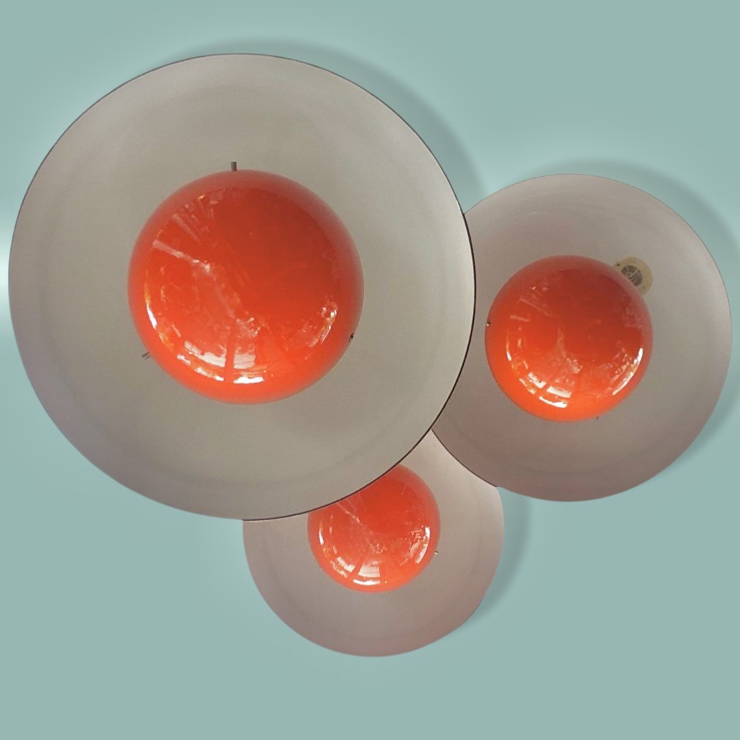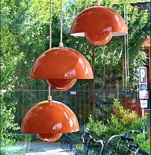 Original Flowerpots VP1 pendels of metal with orangered enamel.