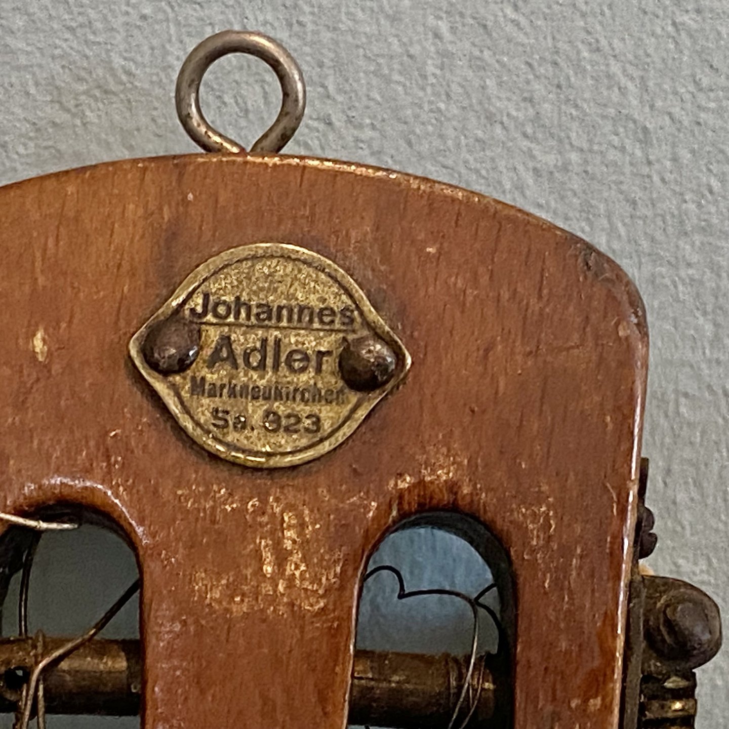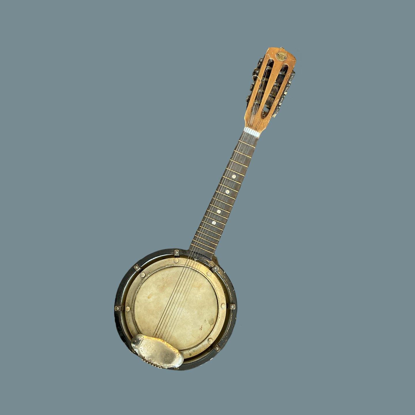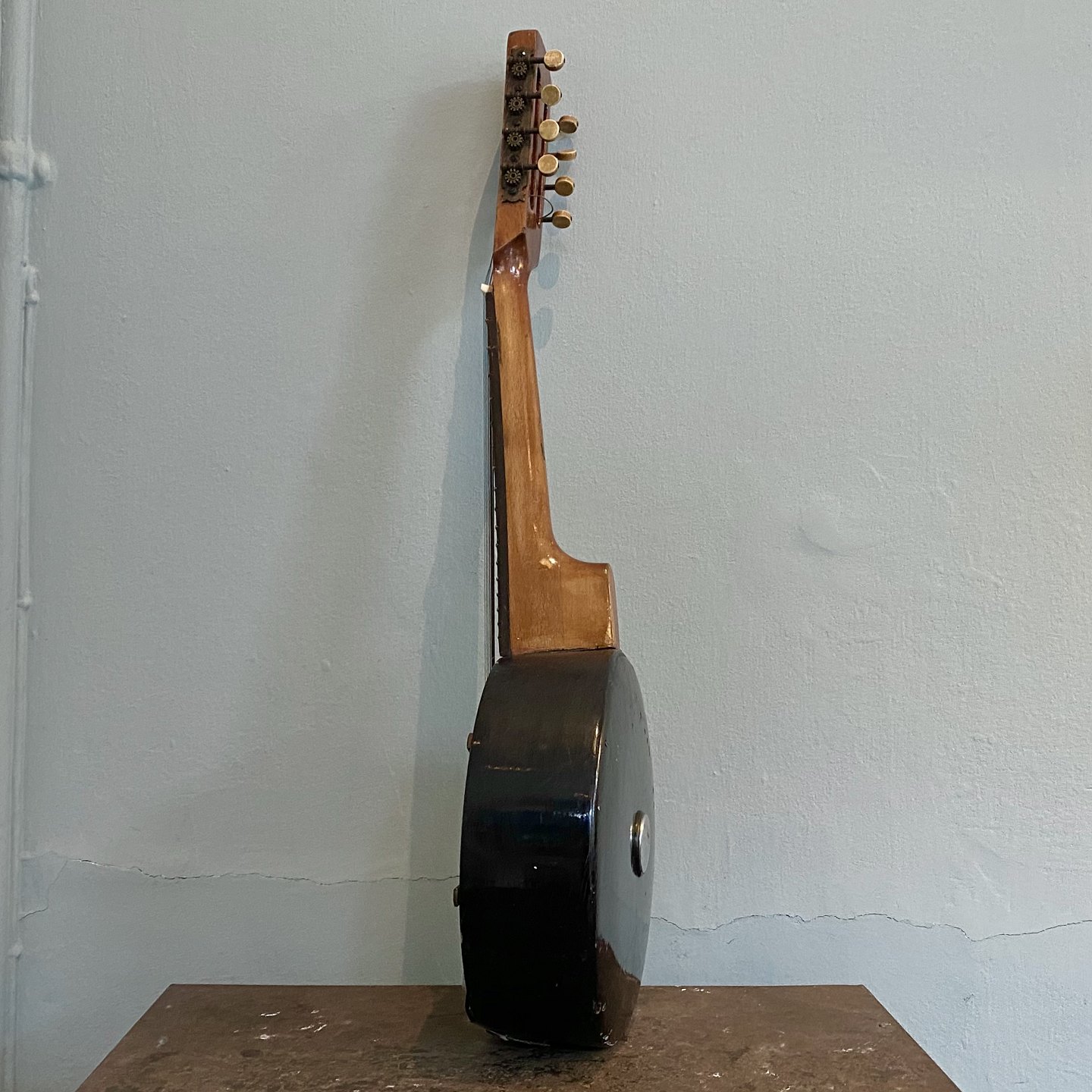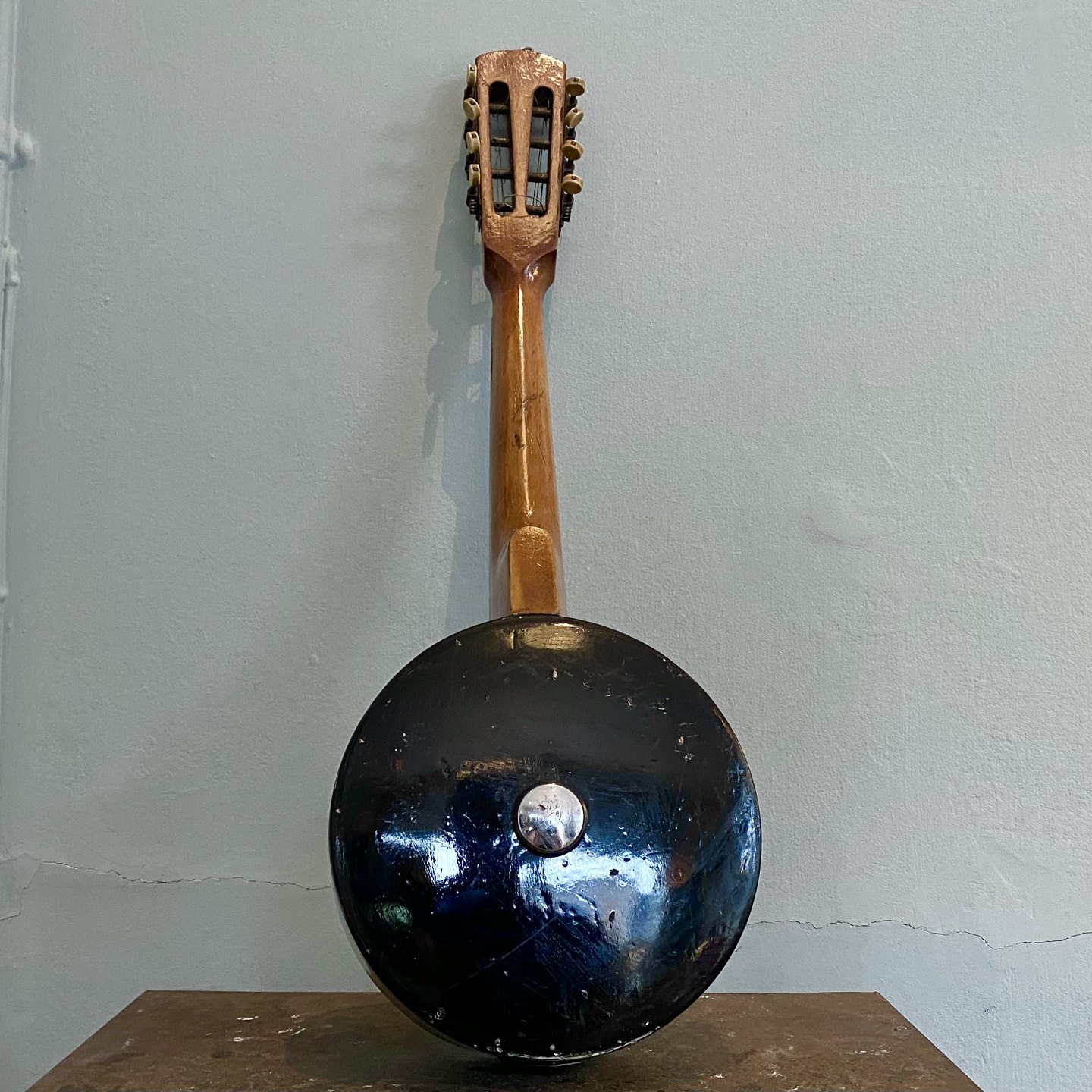 Vintage Banjo with brass sign from Johannes Adler Markneukirchen Sa. 323 The banjo must be described as decoration, as it must be restored before it is ready to play. Dimensions: 57 x 20 x 8.5 cm.