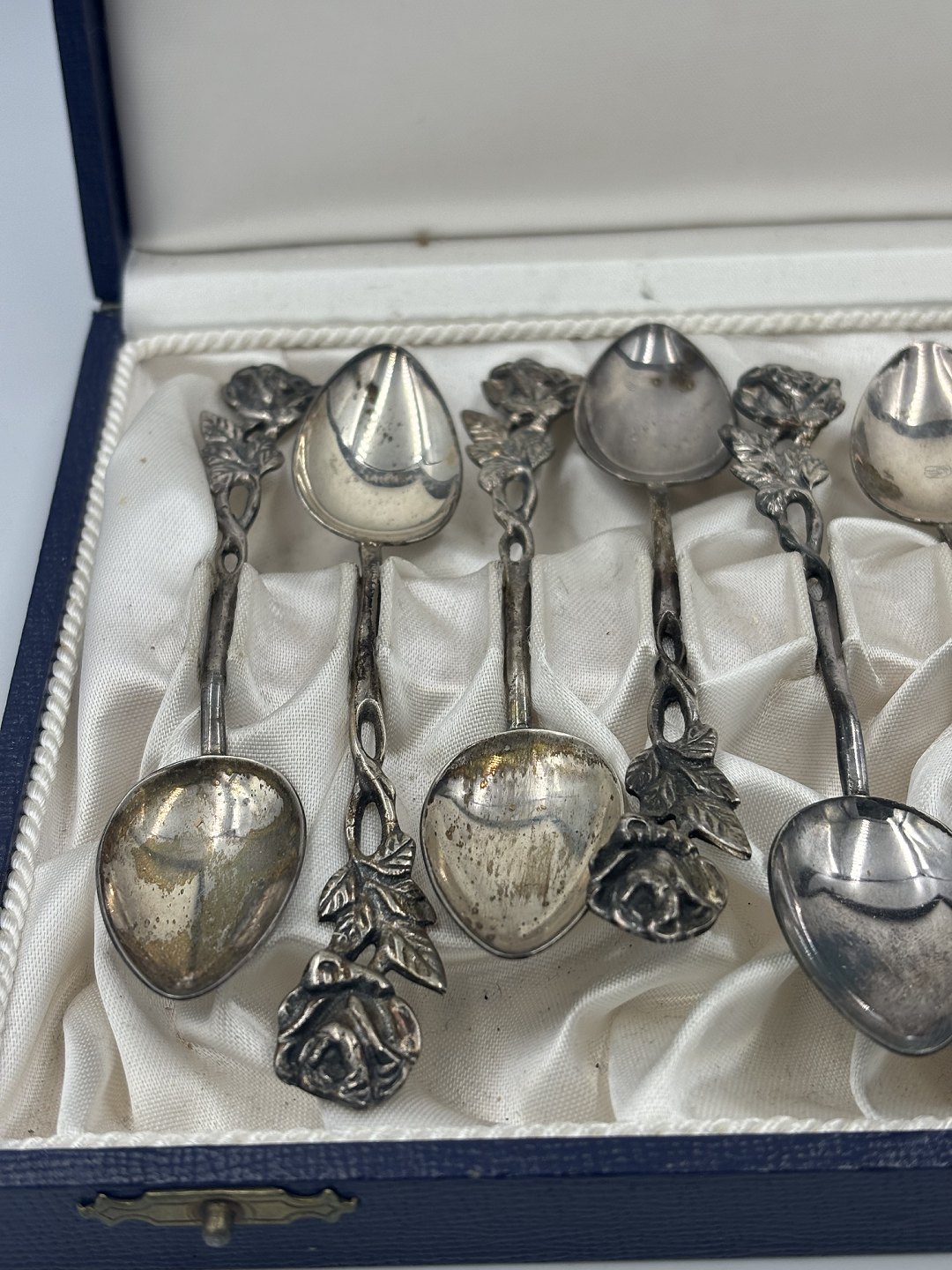 12 sølv tesker Stemplet 9 lødig Samlet vægt 12 stk. 120 gram Box følger med Prisen er samlet