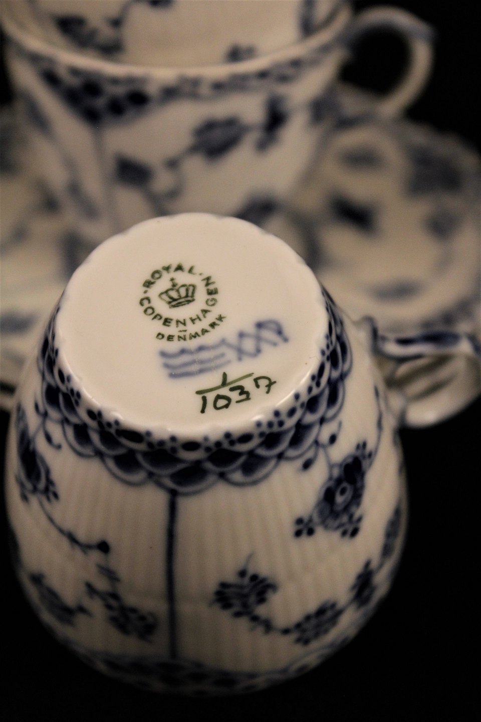 Royal Copenhagen, Blue Fluted , Full lace mocha cup. Factory 2nd. Decoration number: 1/1037. (3 pcs. Available) Item number: RC# 1/1037