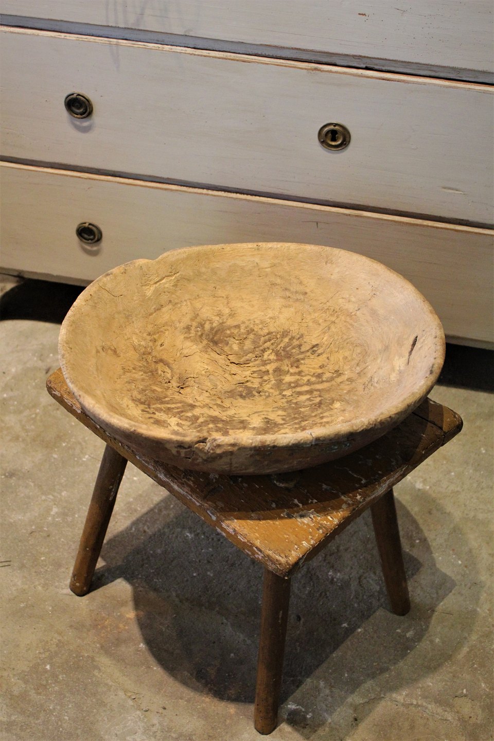 Old Swedish oval 1800 wooden bowl with original color and a super fine patina. H:7cm. Ø:40x33.