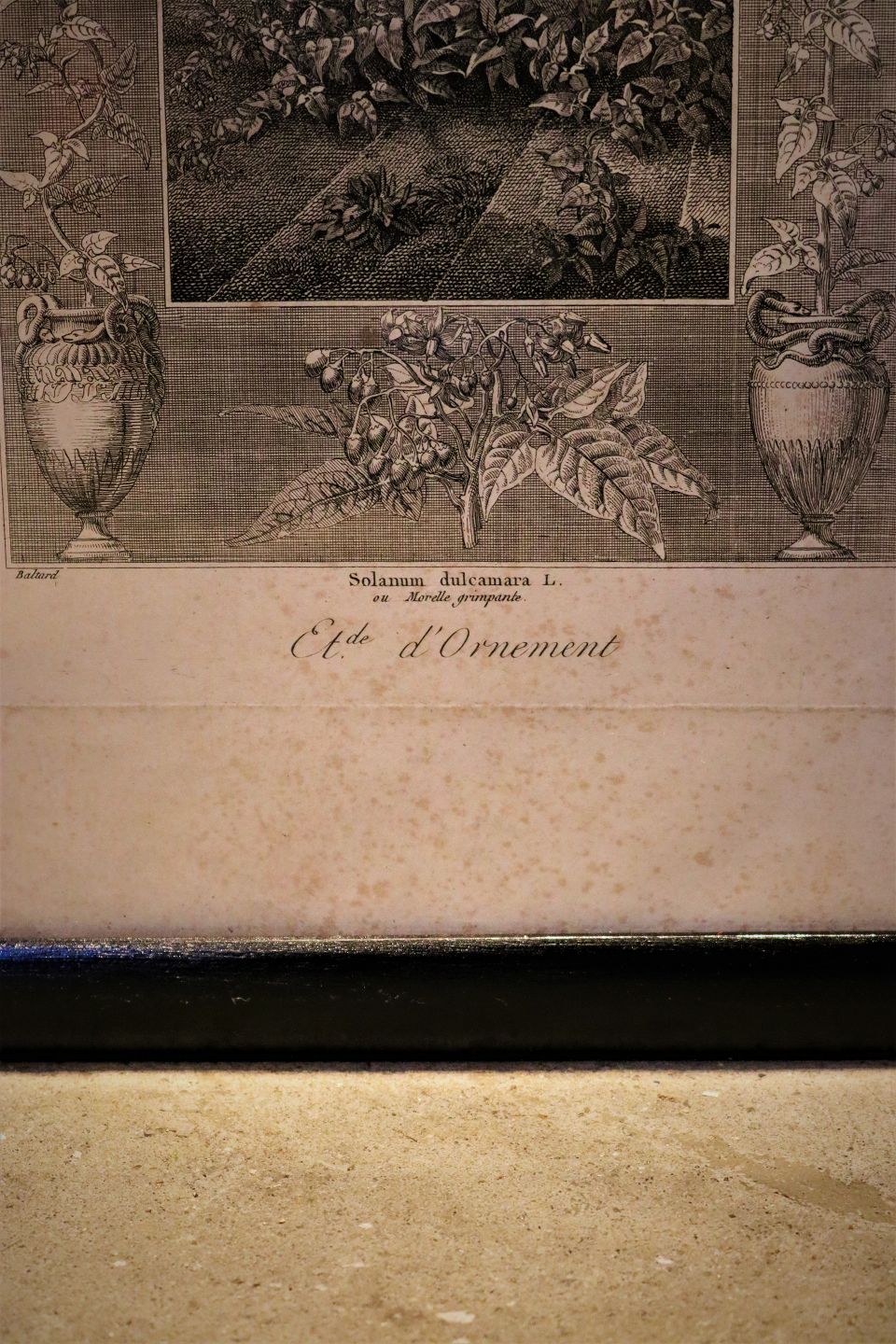 Dekorativt fransk 1800 tals tryk med blomstermotiv i gammel sortmalet træ ramme med originalt håndstrået glas.