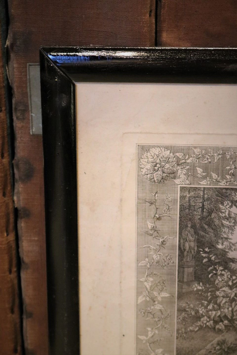 Dekorativt fransk 1800 tals tryk med blomstermotiv indrammet i gammel sortmalet træ ramme med originalt håndstrået glas.
