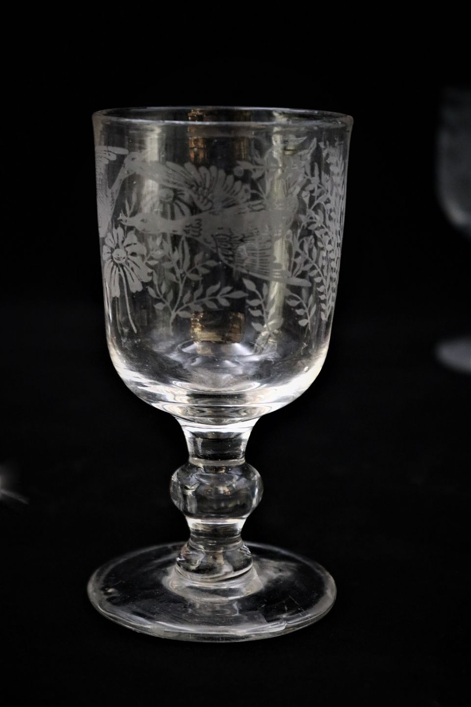 Gamle fransk mundblæste vinglas med slebet motiv af ænder og blomster. Højde: 12/13cm. Dia.:6,5cm.