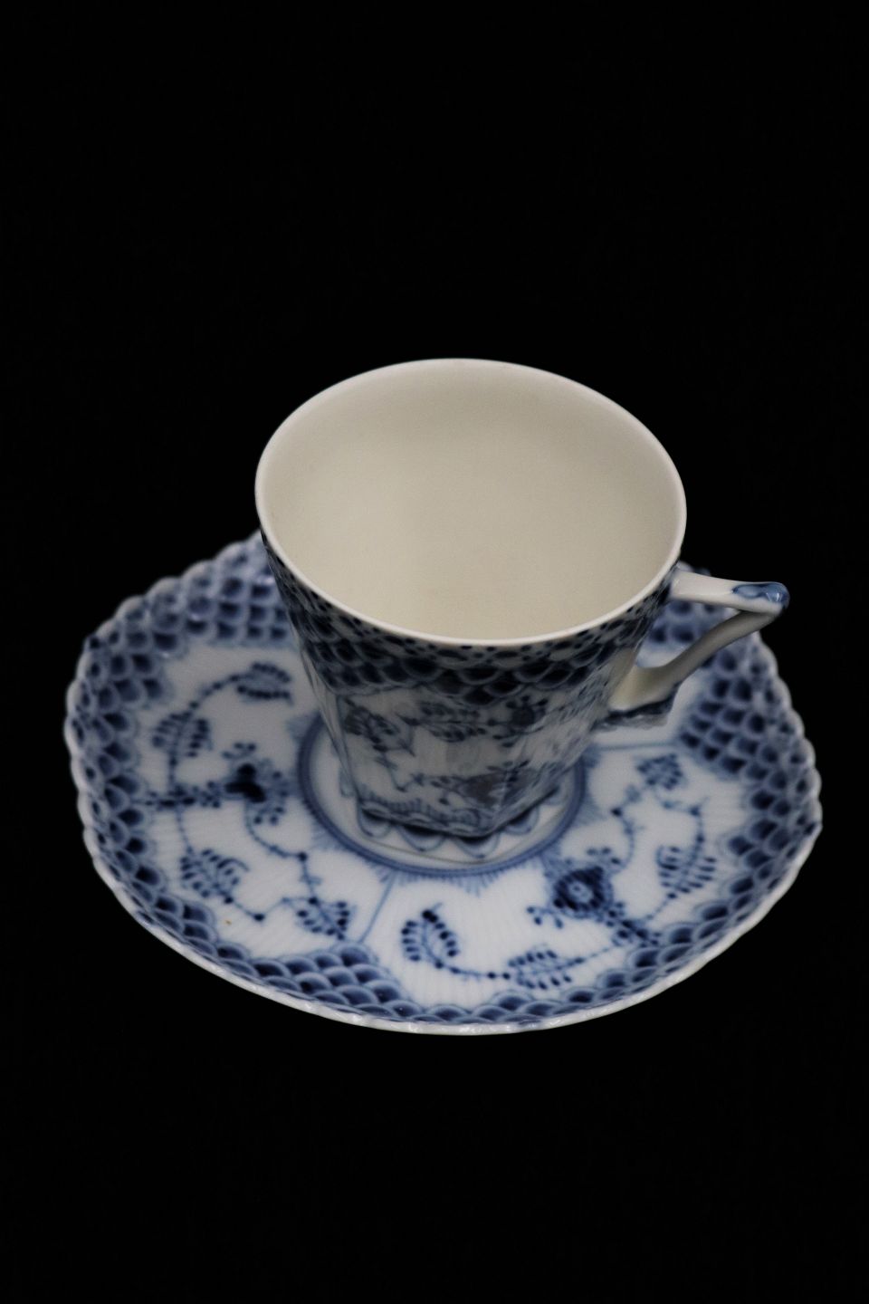 Royal Copenhagen Musselmalet Helblonde chokoladekop med underkop. Dekorations nummer: 1/1036.