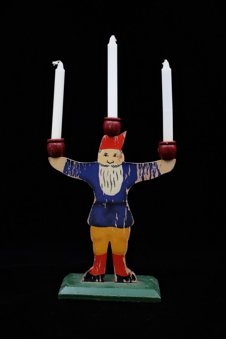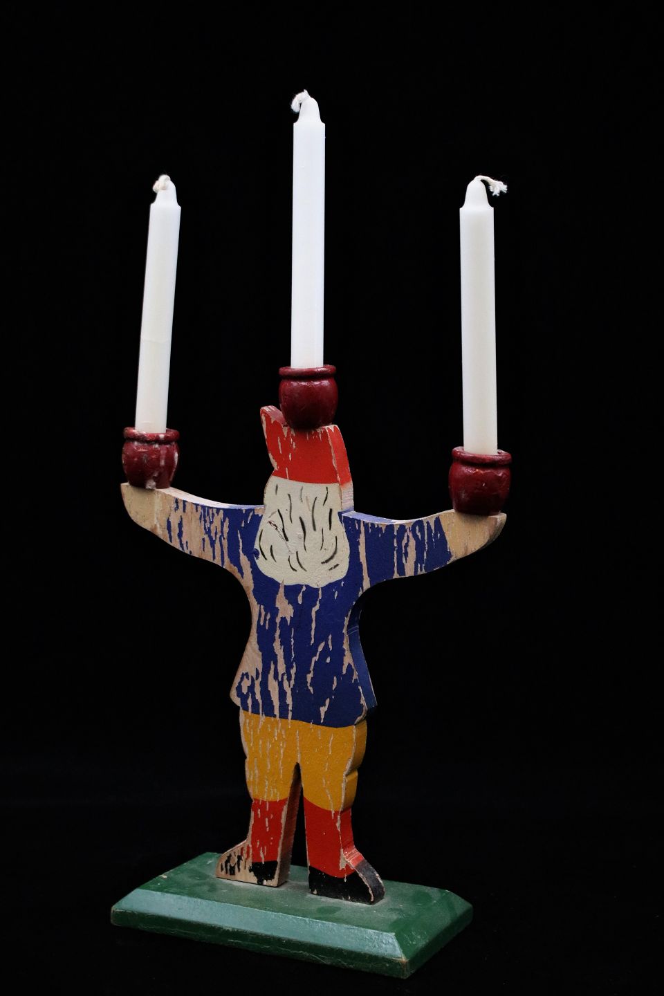 Old Swedish Santa Claus candlestick in carved wood / painted with fine patina from the 50s, and with space for 3 small candles.