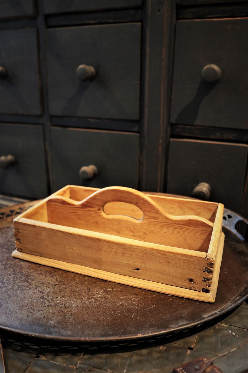Svensk 1800 tals bestik bakke i træ med håndtag og en fin patina.