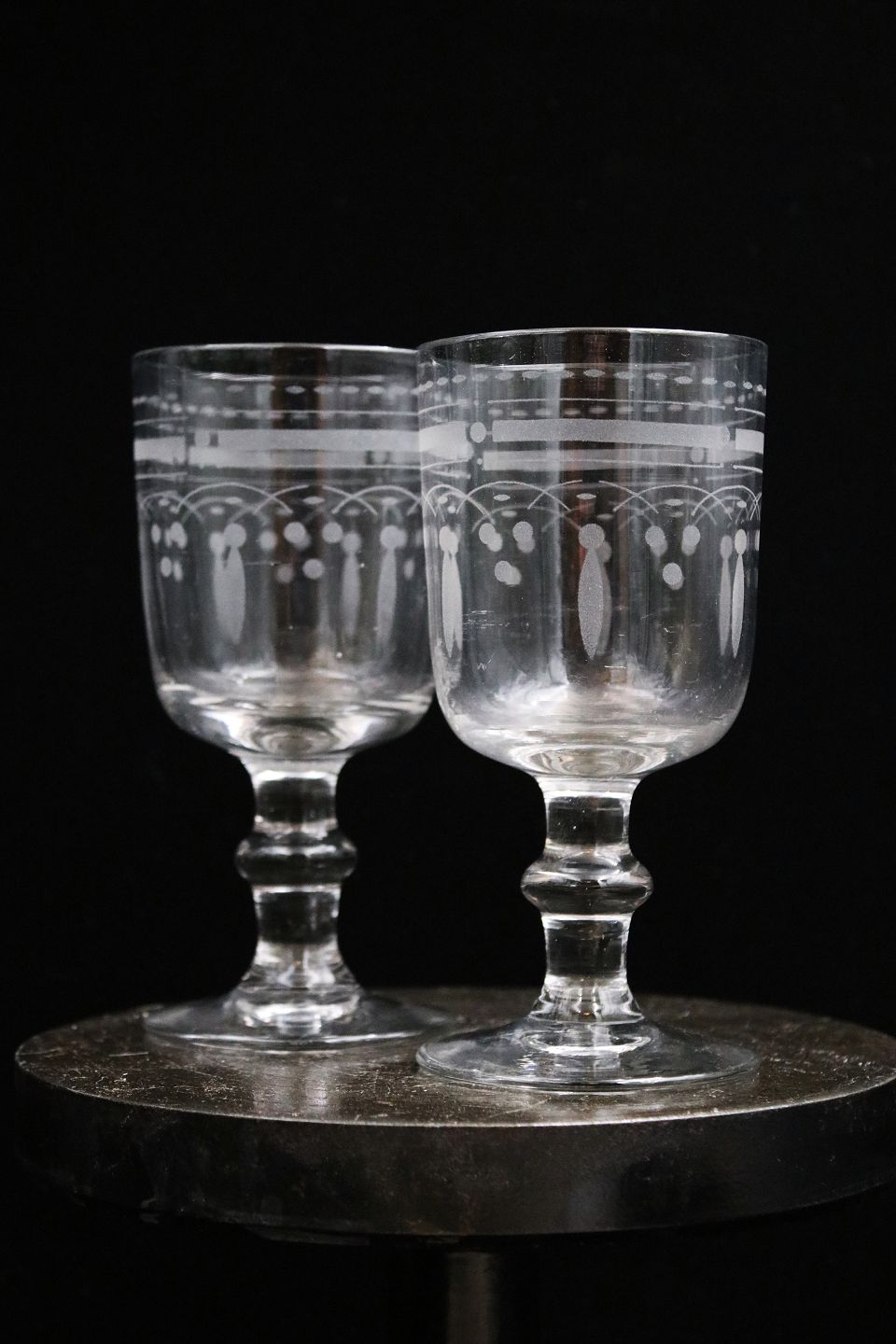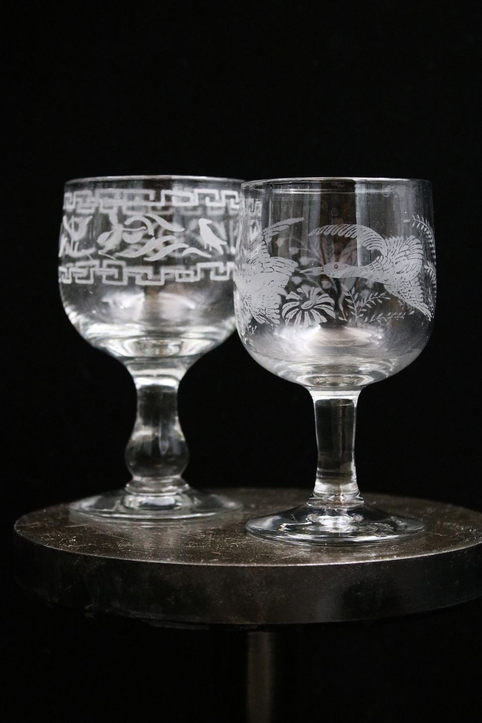Fine assorted, old French mouth-blown wine glasses decorated with various engravings and cuts from flowers to birds motifs.