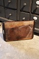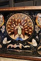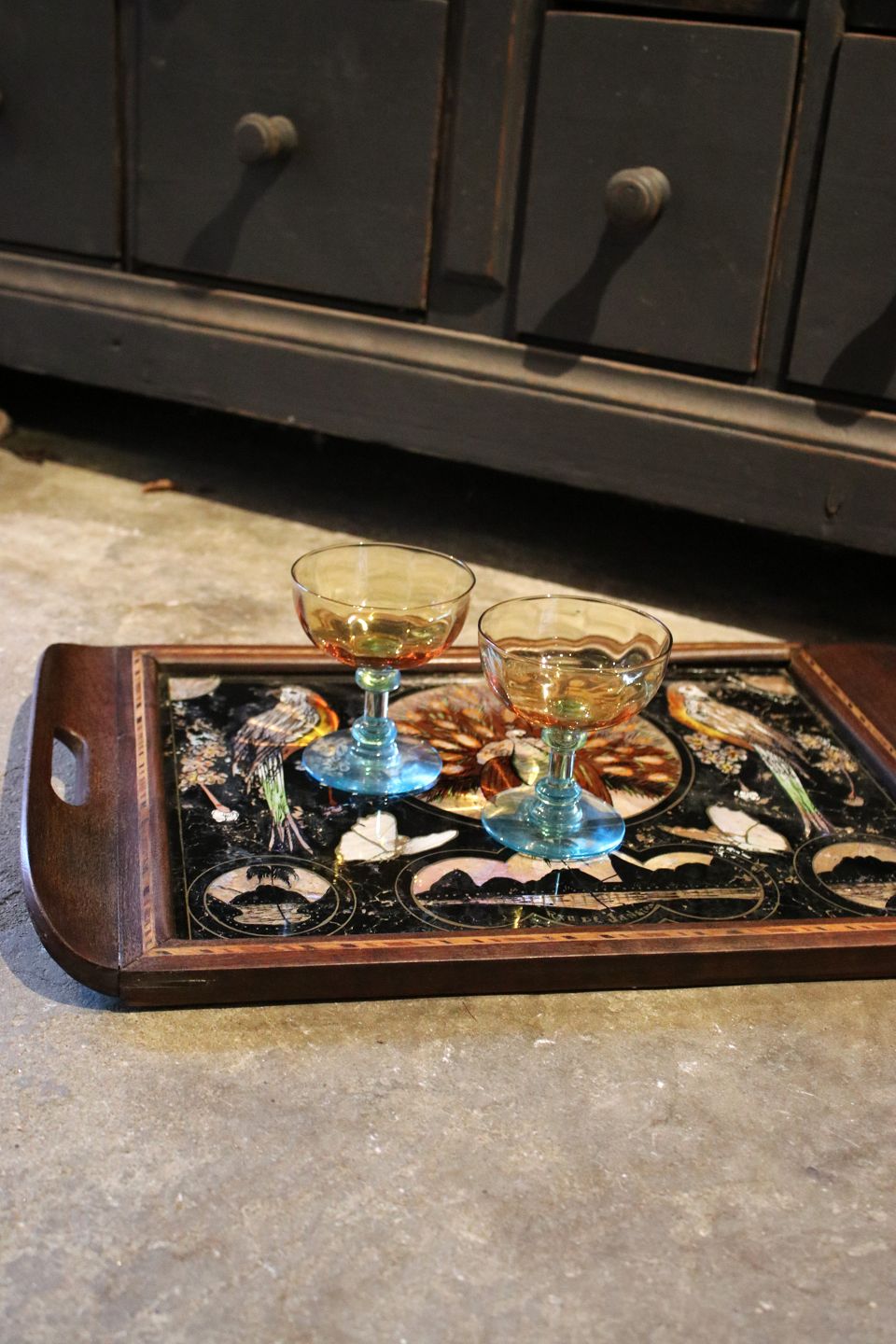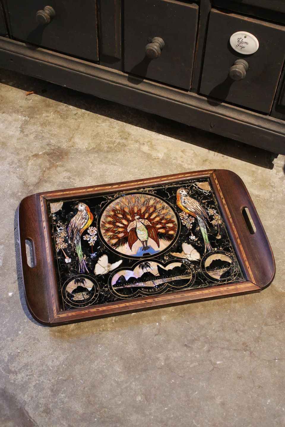 Fin gammel serverings bakke med håndtag i mahogni med indlægninger og fint glasmaleri af påfugl og papegøjer. Måler: 52x34cm.
