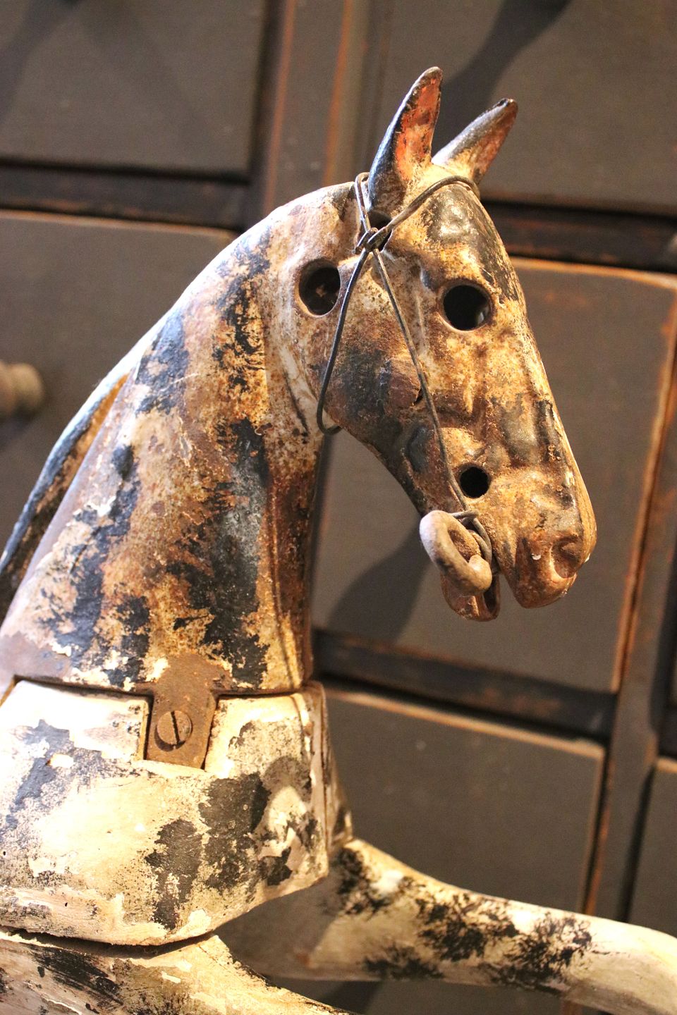 Dekorativ , fransk 1800 tals træ hest med hoved i jern og gammel bemaling med en rigtig fin patina.