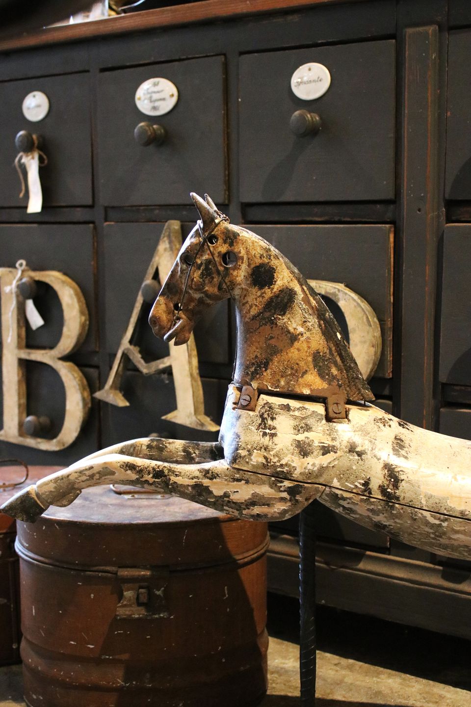 Dekorativ , fransk 1800 tals træ hest med hoved i jern og gammel bemaling med en rigtig fin patina...