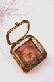 Antique French jewelry box in bronze with faceted glass and silk cushion at the bottom and with a nice old patina. H: 6cm. W&D: 6x6cm.