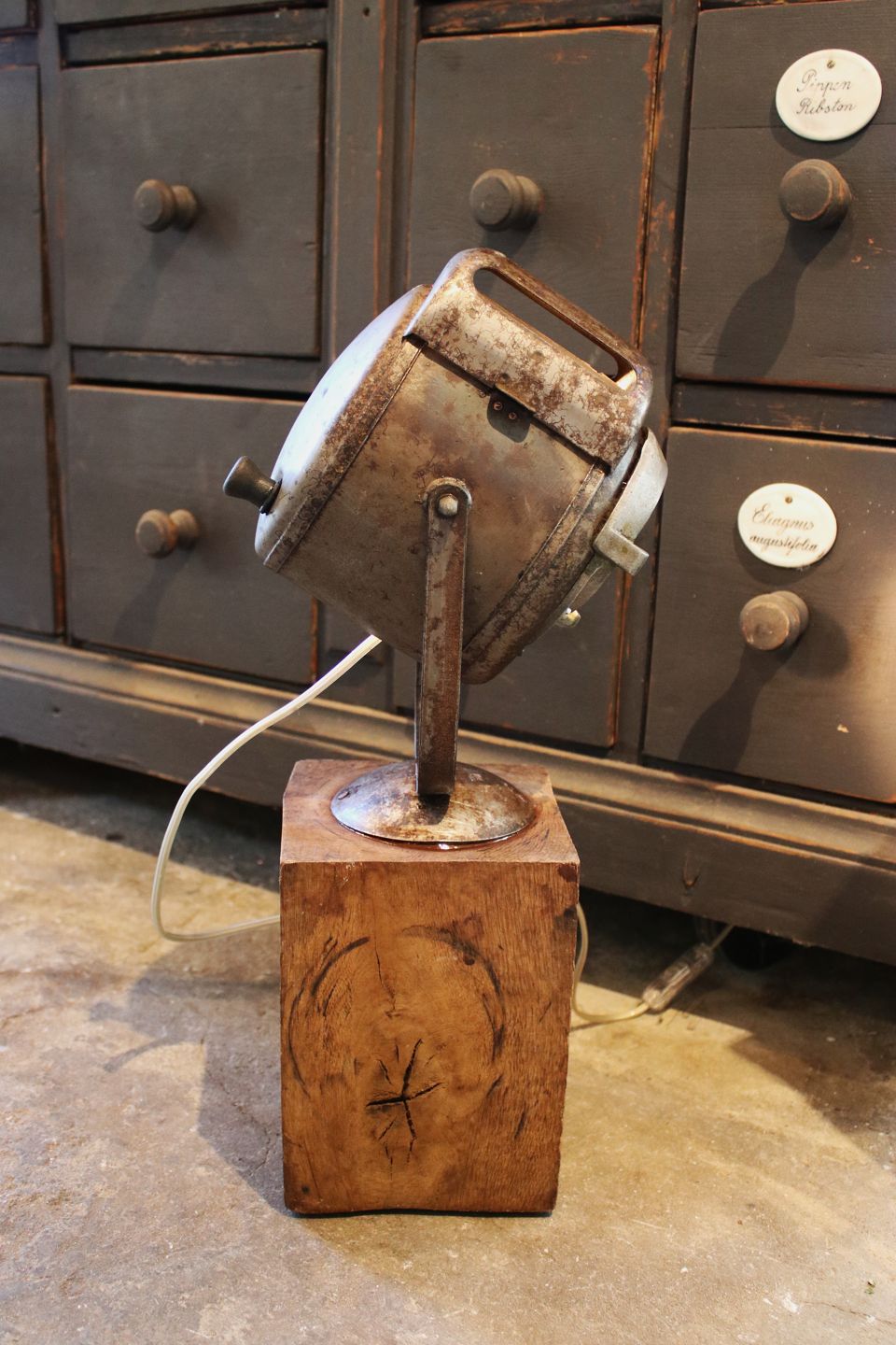 i afpudset metal med super patina fastmonteret på massiv gammel egetræs piedestal. (Kan bruges som bordlampe)